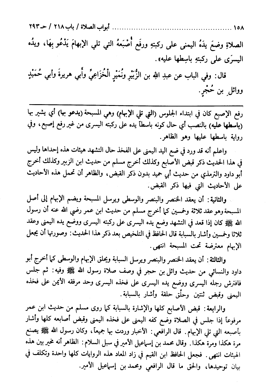 وَالرَّابِعَةُ قَبْضُ الْأَصَابِعِ كُلِّهَا وَالْإِشَارَةُ بِالسَّبَّابَةِ كما روي مسلم من حديث بن عُمَرَ مَرْفُوعًا كَانَ إِذَا جَلَسَ فِي الصَّلَاةِ وَضَعَ كَفَّهُ الْيُمْنَى عَلَى فَخِذِهِ الْيُمْنَى وَقَبَضَ أَصَابِعَهُ كُلَّهَا وَأَشَارَ بِأُصْبُعِهِ الَّتِي تَلِي الْإِبْهَامَ