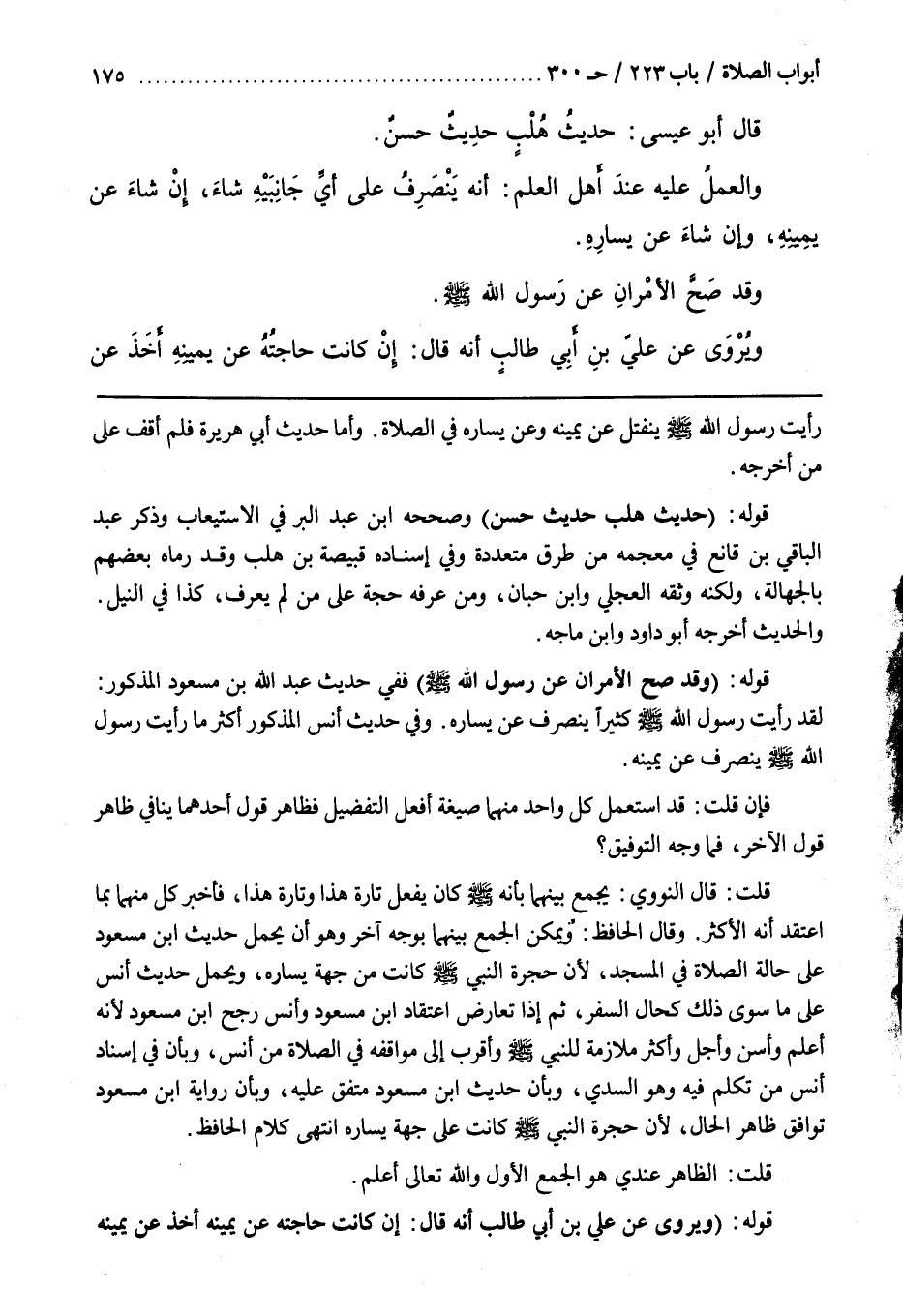 قَوْلُهُ (وَقَدْ صَحَّ الْأَمْرَانِ عَنْ رَسُولِ اللَّهِ صَلَّى اللَّهُ عَلَيْهِ وَسَلَّمَ) فَفِي حَدِيثِ عَبْدِ اللَّهِ بْنِ مَسْعُودٍ الْمَذْكُورِ لَقَدْ رَأَيْتُ رَسُولَ اللَّهِ صَلَّى اللَّهُ عَلَيْهِ وَسَلَّمَ كَثِيرًا يَنْصَرِفُ عَنْ يَسَارِهِ