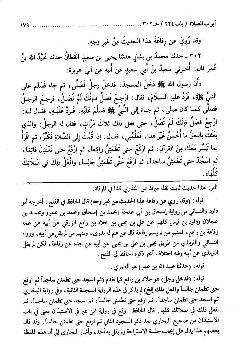 قَوْلُهُ (وَقَدْ رُوِيَ عَنْ رِفَاعَةَ هَذَا الْحَدِيثُ مِنْ غَيْرِ وَجْهٍ) قَالَ الْحَافِظُ فِي الْفَتْحِ أَخْرَجَهُ أَبُو دَاوُدَ وَالنَّسَائِيُّ مِنْ رِوَايَةِ إِسْحَاقَ بْنِ أَبِي طَلْحَةَ وَمُحَمَّدِ بْنِ إِسْحَاقَ وَمُحَمَّدِ بْنِ عَمْرٍو وَمُحَمَّدِ بْنِ عَجْلَانَ وَدَاوُدَ بْنِ قَيْسٍ كُلِّهِمْ عَنْ عَلِيِّ بْنِ يَحْيَى بْنِ خَلَّادِ بْنِ رَافِعٍ الزرفي عَنْ أَبِيهِ عَنْ عَمِّهِ رِفَاعَةَ بْنِ رَافِعٍ فَمِنْهُمْ مَنْ لَمْ يُسَمِّ رِفَاعَةَ قَالَ عَنْ عَمٍّ لَهُ بَدْرِيٍّ وَمِنْهُمْ مَنْ لَمْ يَقُلْ عَنْ أَبِيهِ وَرَوَاهُ النَّسَائِيُّ وَالتِّرْمِذِيُّ مِنْ طَرِيقِ يَحْيَى بْنِ عَلِيِّ بْنِ يَحْيَى عَنْ أَبِيهِ عَنْ جَدِّهِ عَنْ رِفَاعَةَ لَكِنْ لَمْ يَقُلِ التِّرْمِذِيُّ عَنْ أَبِيهِ وَفِيهِ اخْتِلَافٌ آخَرُ ذَكَرَهُ الْحَافِظُ فِي الْفَتْحِ