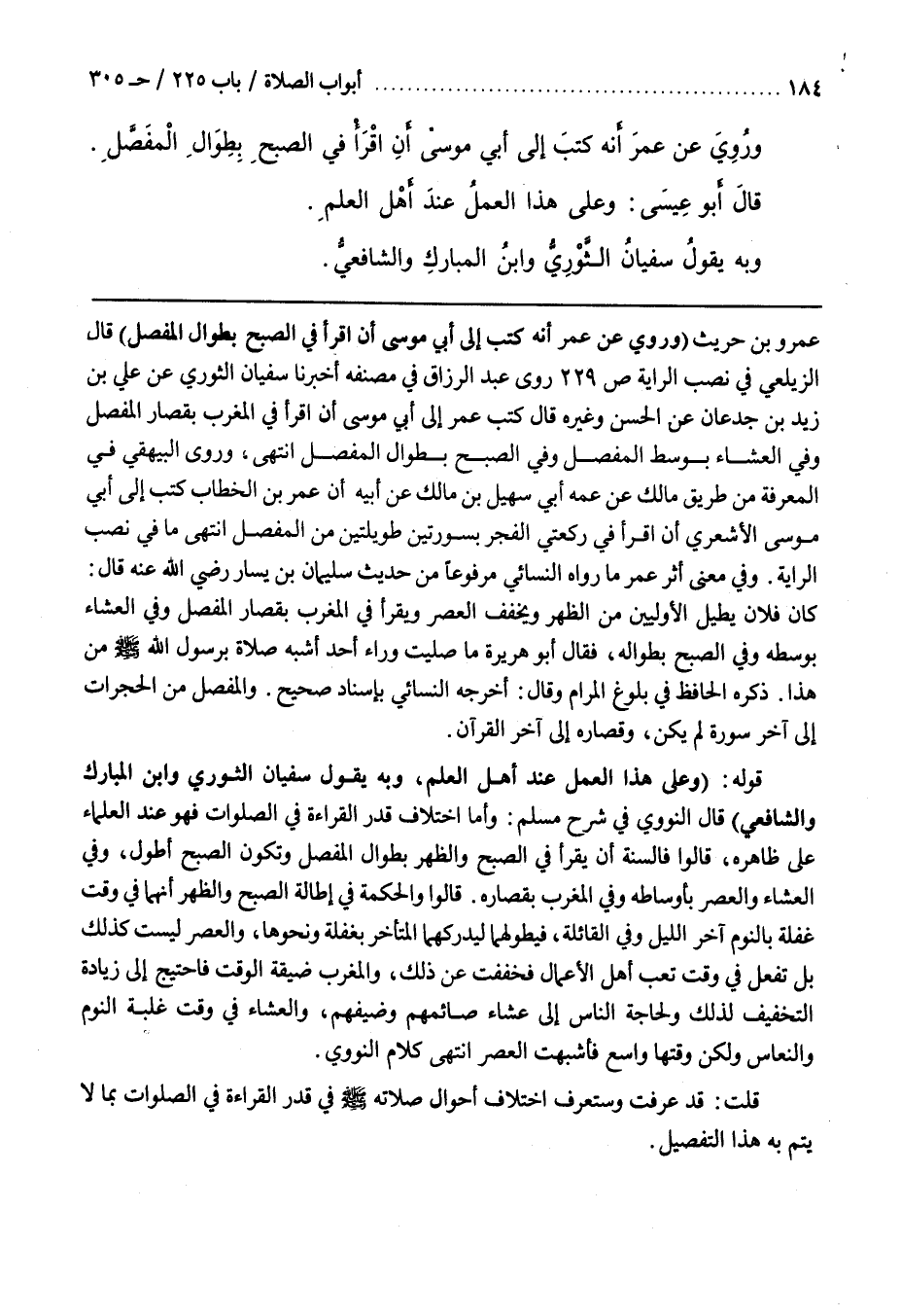 عَمْرِو بْنِ حُرَيْثٍ (وَرُوِيَ عَنْ عُمَرَ أَنَّهُ كَتَبَ إِلَى أَبِي مُوسَى أَنِ اقْرَأْ فِي الصُّبْحِ بِطِوَالِ الْمُفَصَّلِ) قَالَ الزَّيْلَعِيُّ فِي نَصْبِ الرَّايَةِ ص 922 رَوَى عَبْدُ الرَّزَّاقِ فِي مُصَنَّفِهِ أَخْبَرَنَا سُفْيَانُ الثَّوْرِيُّ عَنْ عَلِيِّ بْنِ زَيْدِ بْنِ جُدْعَانَ عَنِ الْحَسَنِ وَغَيْرِهِ قَالَ كَتَبَ عُمَرُ إِلَى أَبِي مُوسَى أَنِ اقْرَأْ فِي الْمَغْرِبِ بِقِصَارِ الْمُفَصَّلِ وَفِي الْعِشَاءِ بِوَسَطِ الْمُفَصَّلِ وَفِي الصُّبْحِ بِطِوَالِ الْمُفَصَّلِ انْتَهَى