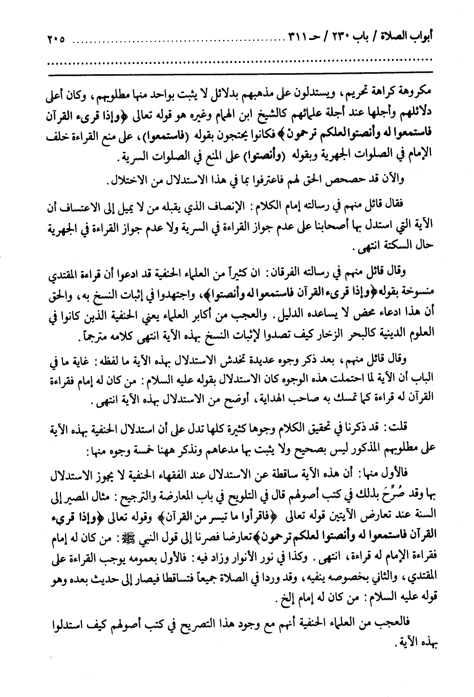 بَعْدَ ذِكْرِ وُجُوهٍ عَدِيدَةٍ تَخْدِشُ الِاسْتِدْلَالَ بِهَذِهِ الْآيَةِ مَا لَفْظُهُ غَايَةُ مَا فِي الْبَابِ أَنَّ الْآيَةَ لَمَّا احْتَمَلَتْ هَذِهِ الْوُجُوهَ كَانَ الِاسْتِدْلَالُ بِقَوْلِهِ عَلَيْهِ السَّلَامُ مَنْ كَانَ لَهُ إِمَامٌ فَقِرَاءَةُ الْقُرْآنِ لَهُ قِرَاءَةٌ كَمَا تَمَسَّكَ بِهِ صَاحِبُ الْهِدَايَةِ أَوْضَحَ مِنَ الِاسْتِدْلَالِ بِهَذِهِ الْآيَةِ انْتَهَى