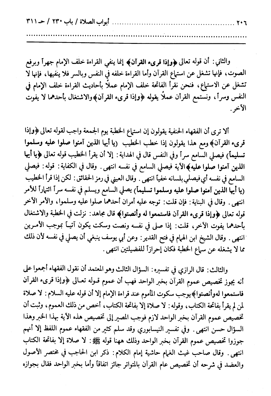 أَلَا تَرَى أَنَّ الْفُقَهَاءَ الْحَنَفِيَّةَ يَقُولُونَ إِنَّ اسْتِمَاعَ الْخُطْبَةِ يَوْمَ الْجُمُعَةِ وَاجِبٌ لِقَوْلِهِ تَعَالَى وَإِذَا قُرِئَ القرآن وَمَعَ هَذَا يَقُولُونَ إِذَا خَطَبَ الْخَطِيبُ يَا أَيُّهَا الَّذِينَ آمَنُوا صَلُّوا عَلَيْهِ وَسَلِّمُوا تسليما فَيُصَلِّي السَّامِعُ سِرًّا وَفِي النَّفْسِ قَالَ فِي الْهِدَايَةِ إِلَّا أَنْ يَقْرَأَ الْخَطِيبُ قَوْلَهُ تَعَالَى يَا أَيُّهَا الَّذِينَ آمَنُوا صلوا عليه الْآيَةَ فَيُصَلِّي السَّامِعُ فِي نَفْسِهِ انْتَهَى