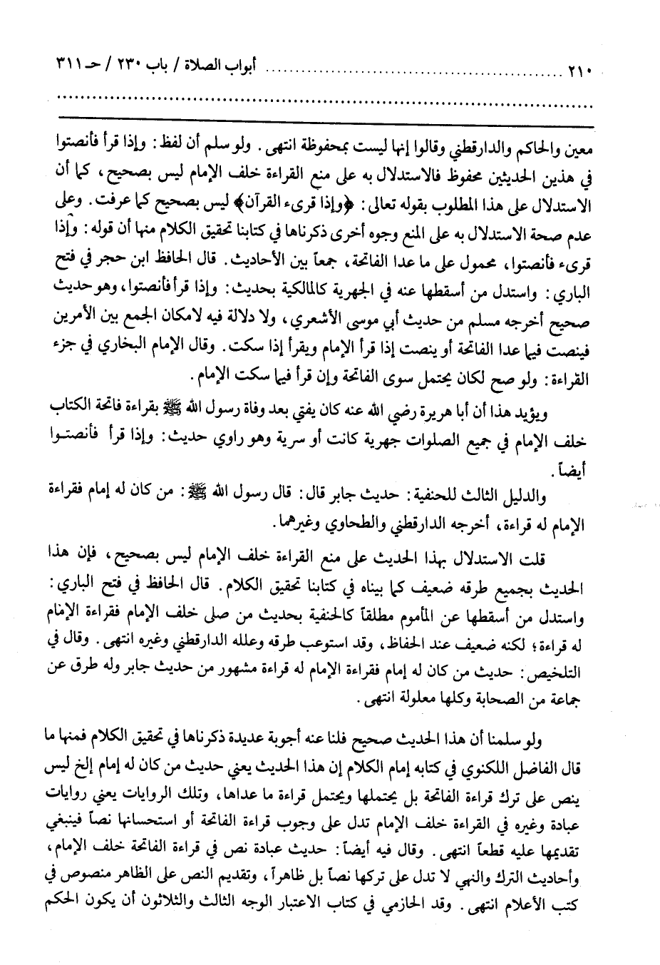 وَعَلَى عَدَمِ صِحَّةِ الِاسْتِدْلَالِ بِهِ عَلَى الْمَنْعِ وُجُوهٌ أُخْرَى ذَكَرْنَاهَا فِي كِتَابِنَا تَحْقِيقِ الْكَلَامِ مِنْهَا أَنَّ قَوْلَهُ وإذا قرئ فَأَنْصِتُوا مَحْمُولٌ عَلَى مَا عَدَا الْفَاتِحَةَ جَمْعًا بين الأحاديث قال الحافظ بن حَجَرٍ فِي فَتْحِ الْبَارِي وَاسْتَدَلَّ مَنْ أَسْقَطَهَا عَنْهُ فِي الْجَهْرِيَّةِ كَالْمَالِكِيَّةِ بِحَدِيثِ وَإِذَا قَرَأَ فَأَنْصِتُوا وَهُوَ حَدِيثٌ صَحِيحٌ أَخْرَجَهُ مُسْلِمٌ مِنْ حَدِيثِ أَبِي مُوسَى الْأَشْعَرِيِّ وَلَا دَلَالَةَ فِيهِ لِإِمْكَانِ الْجَمْعِ بَيْنَ الْأَمْرَيْنِ فَيُنْصِتُ فِيمَا عَدَا الْفَاتِحَةَ أَوْ يُنْصِتُ إِذَا قَرَأَ الْإِمَامُ وَيَقْرَأُ إِذَا سَكَتَ