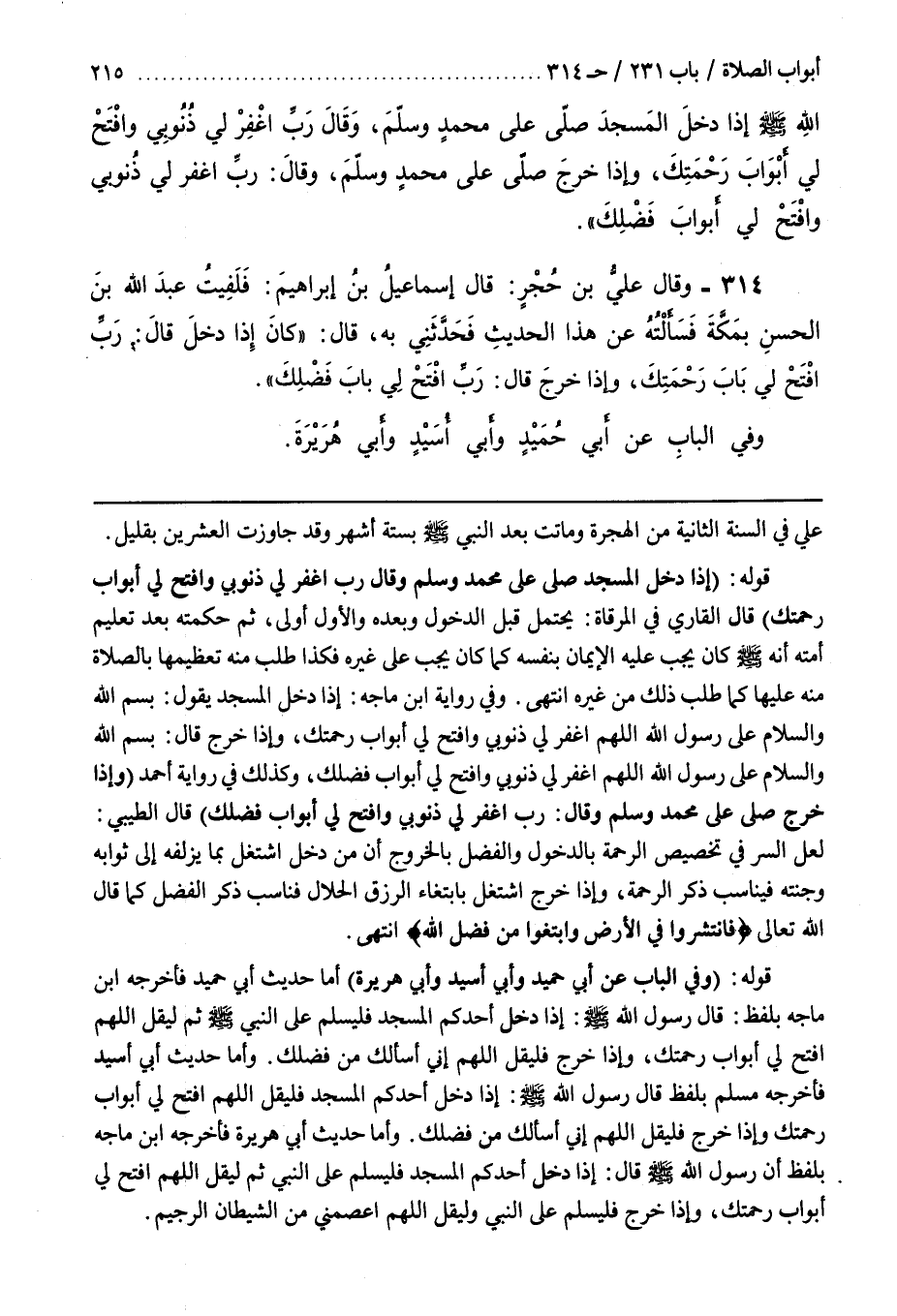[315] قَوْلُهُ (وَفِي الْبَابِ عَنْ أَبِي حُمَيْدٍ وَأَبِي أَسِيدٍ وَأَبِي هُرَيْرَةَ) أَمَّا حَدِيثُ أَبِي حميد فأخرجه بن مَاجَهْ بِلَفْظِ قَالَ رَسُولُ اللَّهِ صَلَّى اللَّهُ عَلَيْهِ وَسَلَّمَ إِذَا دَخَلَ أَحَدُكُمُ الْمَسْجِدَ فَلْيُسَلِّمْ عَلَى النَّبِيِّ صَلَّى اللَّهُ عَلَيْهِ وَسَلَّمَ ثُمَّ لْيَقُلِ اللَّهُمَّ افْتَحْ لِي أَبْوَابَ رَحْمَتِكَ وَإِذَا خَرَجَ فَلْيَقُلِ اللَّهُمَّ إِنِّي أَسْأَلُكَ مِنْ فَضْلِكَ