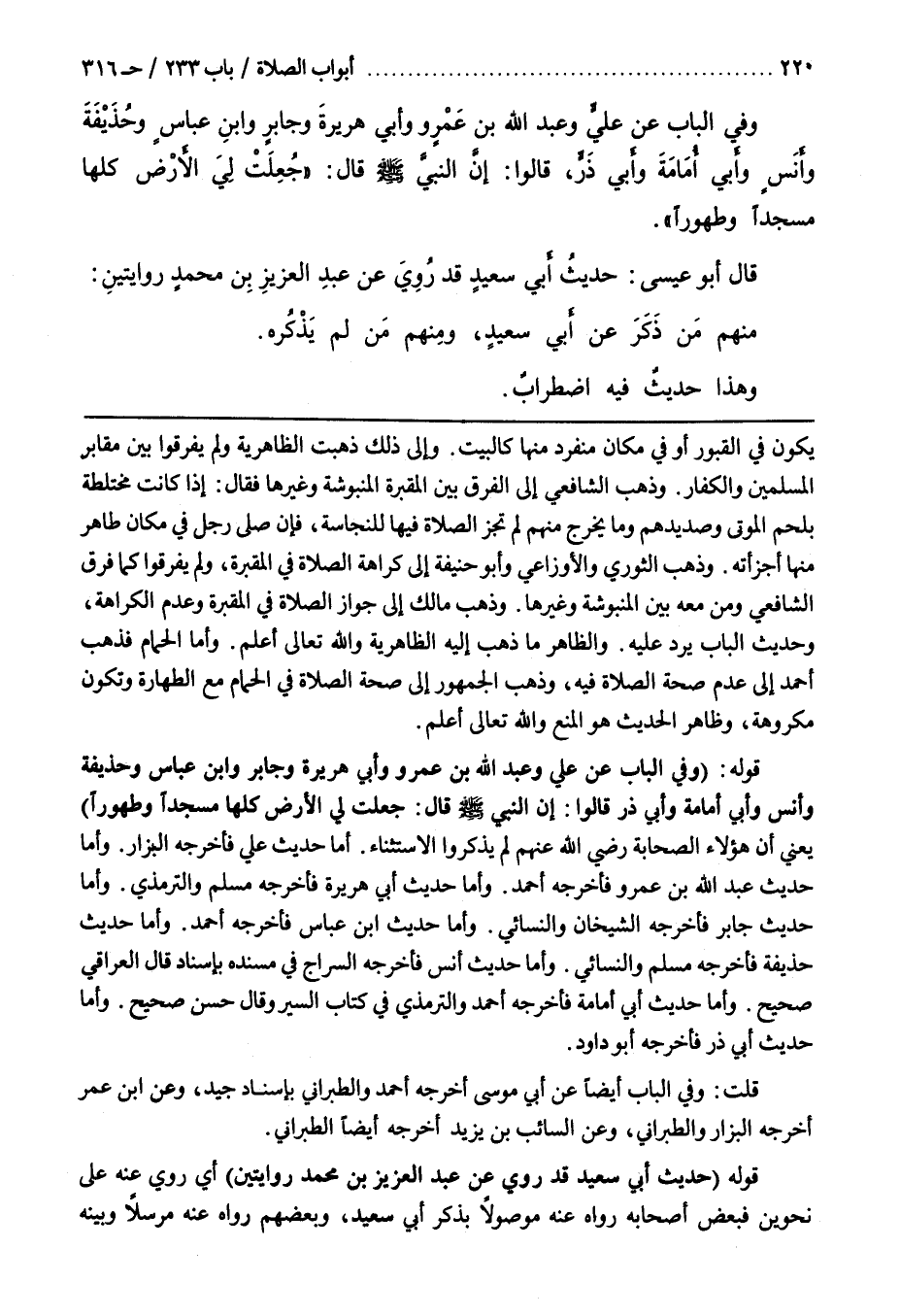 إِنَّ النَّبِيَّ صَلَّى اللَّهُ عَلَيْهِ وَسَلَّمَ قَالَ جُعِلَتْ لِيَ الْأَرْضُ كُلُّهَا مَسْجِدًا وَطَهُورًا يعني أن هؤلاء الصحابة رضي الله عنه لَمْ يَذْكُرُوا الِاسْتِثْنَاءَ