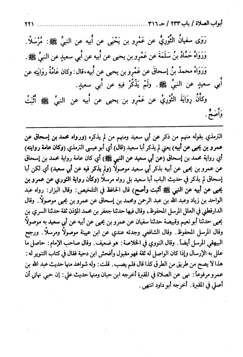 التِّرْمِذِيُّ بِقَوْلِهِ مِنْهُمْ مَنْ ذَكَرَ عَنْ أَبِي سَعِيدٍ وَمِنْهُمْ مَنْ لَمْ يَذْكُرْهُ قَوْلُهُ (وَرَوَاهُ محمد بن إسحاق عن عمرو بن يحيى عَنْ أَبِيهِ) يَعْنِي لَمْ يَذْكُرْ أَبَا سَعِيدٍ (قَالَ) أَيْ أَبُو عِيسَى التِّرْمِذِيُّ (وَكَانَ عَامَّةُ رِوَايَتِهِ) أَيْ رِوَايَةُ مُحَمَّدِ بْنِ إِسْحَاقَ (عَنْ أَبِي سَعِيدٍ عَنِ النَّبِيِّ صَلَّى اللَّهُ عَلَيْهِ وَسَلَّمَ) أَيْ كَانَ عَامَّةُ رِوَايَةِ مُحَمَّدِ بْنِ إِسْحَاقَ عَنْ عَمْرِو بْنِ يَحْيَى عَنْ أَبِيهِ بِذَكَرِ أَبِي سَعِيدٍ مَوْصُولًا (وَلَمْ يَذْكُرْ فِيهِ عَنْ أَبِي سَعِيدٍ) أَيْ لَكِنَّ أَبَا إِسْحَاقَ لَمْ يَذْكُرْ فِي حَدِيثِ الْبَابِ أَبَا سَعِيدٍ بَلْ رَوَاهُ مُرْسَلًا (وَكَأَنَّ رِوَايَةَ الثَّوْرِيِّ عَنْ عَمْرِو بْنِ يَحْيَى عَنْ أَبِيهِ عَنِ النَّبِيِّ صَلَّى اللَّهُ عَلَيْهِ وَسَلَّمَ أَثْبَتُ وَأَصَحُّ) قَالَ الْحَافِظُ فِي التَّلْخِيصِ وَقَالَ الْبَزَّارُ رَوَاهُ عَبْدُ الْوَاحِدِ بْنُ زِيَادٍ وَعَبْدُ اللَّهِ بْنُ عَبْدِ الرَّحْمَنِ وَمُحَمَّدُ بْنُ إِسْحَاقَ عَنْ عَمْرِو بْنِ يَحْيَى مَوْصُولًا وَقَالَ الدَّارَقُطْنِيُّ فِي الْعِلَلِ الْمُرْسَلُ الْمَحْفُوظُ وَقَالَ فِيهَا حَدَّثَنَا جَعْفَرُ بْنُ مُحَمَّدٍ الْمُؤَذِّنُ ثِقَةٌ حَدَّثَنَا السُّرِّيُّ بْنُ يَحْيَى حَدَّثَنَا أَبُو نُعَيْمٍ وَقَبِيصَةُ حَدَّثَنَا سُفْيَانُ عَنْ عَمْرِو بْنِ يَحْيَى عَنْ أَبِيهِ عَنْ أَبِي سَعِيدٍ بِهِ مَوْصُولًا وَقَالَ الْمُرْسَلُ الْمَحْفُوظُ