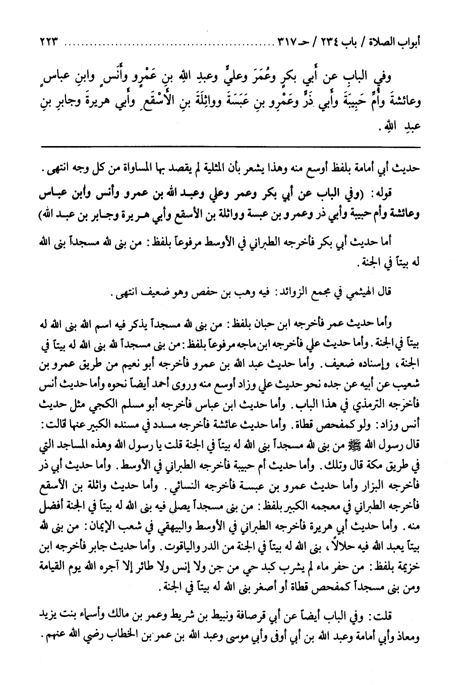 أَمَّا حَدِيثُ أَبِي بَكْرٍ فَأَخْرَجَهُ الطَّبَرَانِيُّ فِي الْأَوْسَطِ مَرْفُوعًا بِلَفْظِ مَنْ بَنَى لِلَّهِ مَسْجِدًا بَنَى اللَّهُ لَهُ بَيْتًا فِي الْجَنَّةِ