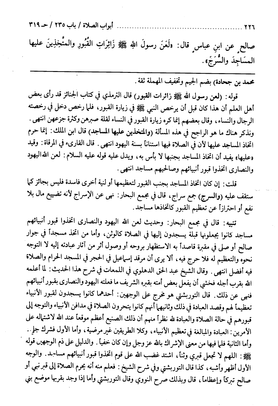 وَنَذْكُرُ هُنَاكَ مَا هُوَ الرَّاجِحُ فِي هَذِهِ الْمَسْأَلَةِ (والمتخذين عليها المساجد) قال بن الْمَلَكِ إِنَّمَا حَرَّمَ اتِّخَاذَ الْمَسَاجِدِ عَلَيْهَا لِأَنَّ فِي الصَّلَاةِ فِيهَا اسْتِنَانًا بِسُنَّةِ الْيَهُودِ انْتَهَى