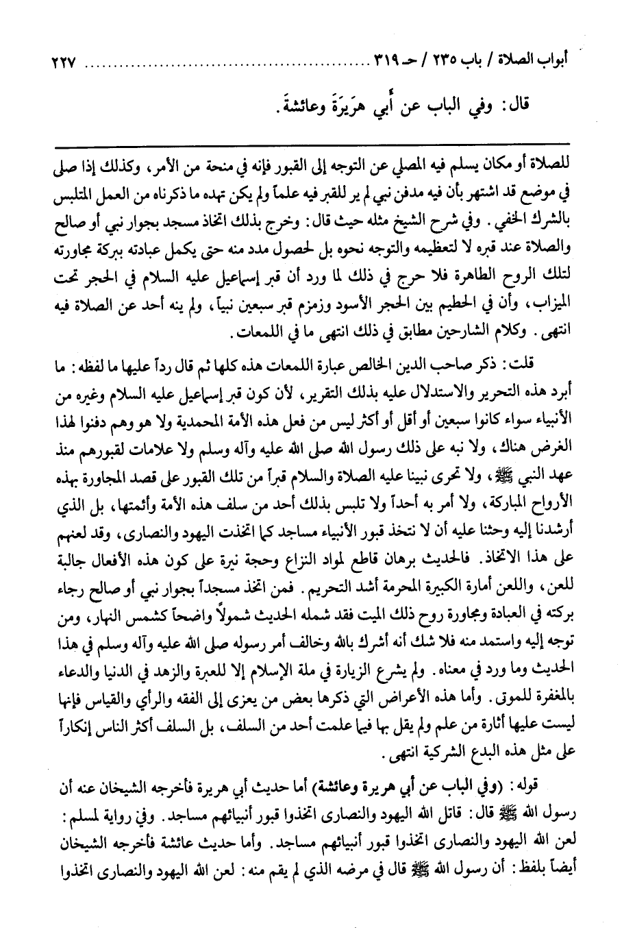 فَمَنِ اتَّخَذَ مَسْجِدًا بِجِوَارِ نَبِيٍّ أَوْ صَالِحٍ رَجَاءَ بَرَكَتِهِ فِي الْعِبَادَةِ وَمُجَاوَرَةِ رُوحِ ذَلِكَ الْمَيِّتِ فَقَدْ شَمِلَهُ الْحَدِيثُ شُمُولًا وَاضِحًا كَشَمْسِ النَّهَارِ وَمَنْ تَوَجَّهَ إِلَيْهِ وَاسْتَمَدَّ مِنْهُ فَلَا شَكَّ أَنَّهُ أَشْرَكَ بِاللَّهِ وَخَالَفَ أَمْرَ رَسُولِ اللَّهِ صَلَّى اللَّهُ عَلَيْهِ وَآلِهِ وَسَلَّمَ فِي هَذَا الْحَدِيثِ وَمَا وَرَدَ فِي مَعْنَاهُ