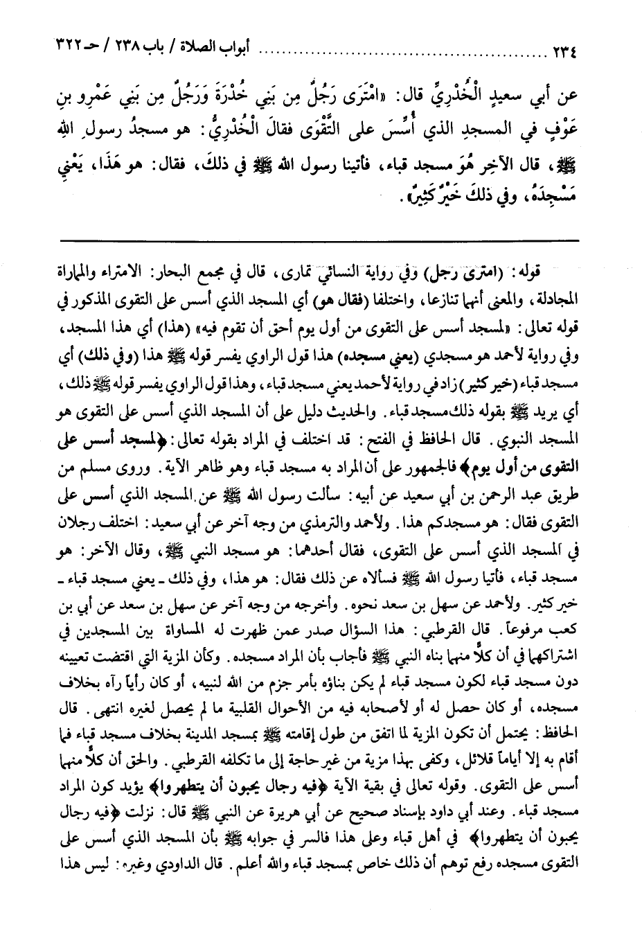 قَالَ الْحَافِظُ فِي الْفَتْحِ قَدِ اخْتُلِفَ فِي الْمُرَادِ بِقَوْلِهِ تَعَالَى لَمَسْجِدٌ أُسِّسَ عَلَى التَّقْوَى مِنْ أَوَّلِ يوم فَالْجُمْهُورُ عَلَى أَنَّ الْمُرَادَ بِهِ مَسْجِدُ قُبَاءٍ وَهُوَ ظَاهِرُ الْآيَةِ