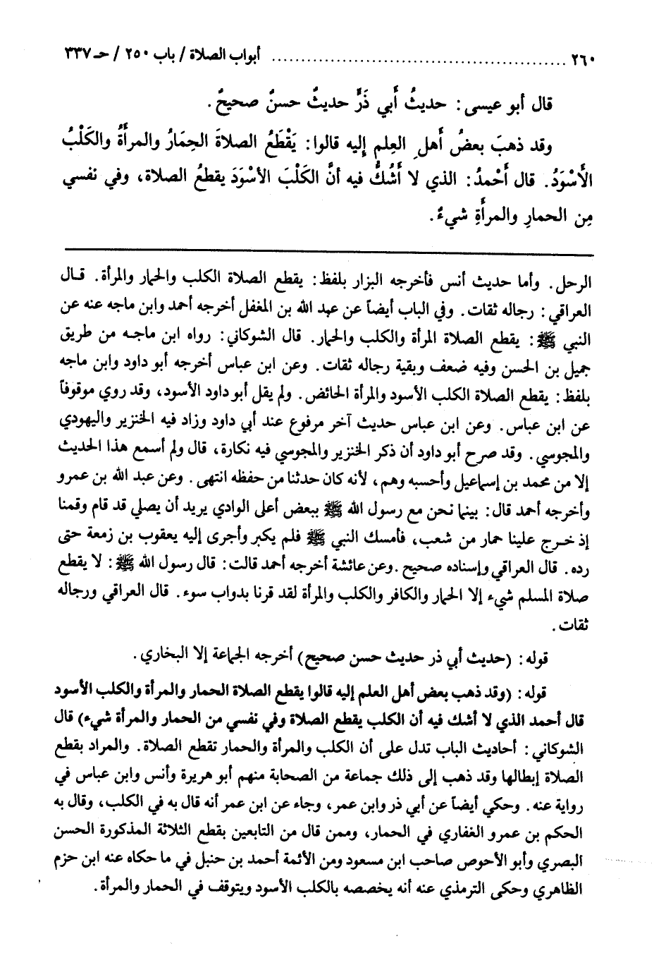 قَوْلُهُ (وَقَدْ ذَهَبَ بَعْضُ أَهْلِ الْعِلْمِ إِلَيْهِ قَالُوا يَقْطَعُ الصَّلَاةَ الْحِمَارُ وَالْمَرْأَةُ وَالْكَلْبُ الْأَسْوَدُ قَالَ أَحْمَدُ الَّذِي لَا أَشُكُّ فِيهِ أَنَّ الْكَلْبَ الْأَسْوَدَ يَقْطَعُ الصَّلَاةَ وَفِي نَفْسِي مِنَ الْحِمَارِ وَالْمَرْأَةِ شَيْءٌ) قَالَ الشَّوْكَانِيُّ أَحَادِيثُ الْبَابِ تَدُلُّ عَلَى أَنَّ الْكَلْبَ وَالْمَرْأَةَ وَالْحِمَارَ تَقْطَعُ الصَّلَاةَ