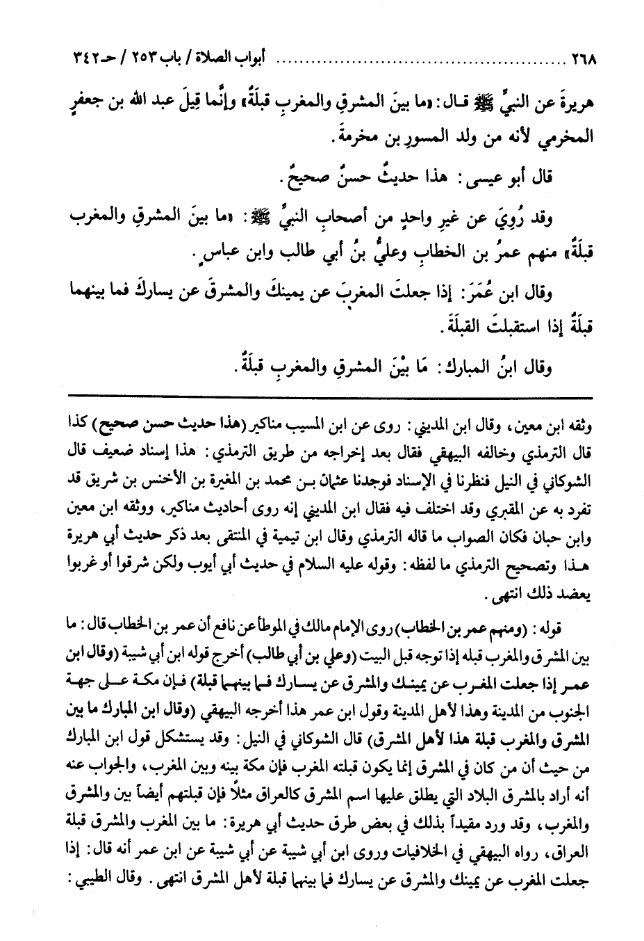 قَوْلُهُ (منهم عُمَرُ بْنُ الْخَطَّابِ) رَوَى الْإِمَامُ مَالِكٌ فِي الْمُوَطَّأِ عَنْ نَافِعٍ أَنَّ عُمَرَ بْنَ الْخَطَّابِ قَالَ مَا بَيْنَ الْمَشْرِقِ وَالْمَغْرِبِ قِبْلَةٌ إِذَا تَوَجَّهَ قِبَلَ الْبَيْتِ (وَعَلِيُّ بْنُ أَبِي طَالِبٍ) أخرج قوله بن أبي شيبة (وقال بن عُمَرَ إِذَا جَعَلْتَ الْمَغْرِبَ عَنْ يَمِينِكَ وَالْمَشْرِقَ عَنْ يَسَارِكَ فَمَا بَيْنَهُمَا قِبْلَةٌ) فَإِنَّ مَكَّةَ عَلَى جِهَةِ الْجَنُوبِ مِنَ الْمَدِينَةِ وَهَذَا لِأَهْلِ المدينة وقول بن عمر هذا أخرجه البيهقي (وقال بن الْمُبَارَكِ مَا بَيْنَ الْمَشْرِقِ وَالْمَغْرِبِ قِبْلَةٌ هَذَا لِأَهْلِ الْمَشْرِقِ) قَالَ الشَّوْكَانِيُّ فِي النَّيْلِ وَقَدْ يستشكل قول بن الْمُبَارَكِ مِنْ حَيْثُ إِنَّ مَنْ فِي الْمَشْرِقِ إِنَّمَا يَكُونُ قِبْلَتُهُ الْمَغْرِبَ فَإِنَّ مَكَّةَ بَيْنَهُ وَبَيْنَ الْمَغْرِبِ وَالْجَوَابُ عَنْهُ أَنَّهُ أَرَادَ بِالْمَشْرِقِ الْبِلَادَ الَّتِي يُطْلَقُ عَلَيْهَا اسْمُ الْمَشْرِقِ كَالْعِرَاقِ مَثَلًا فَإِنَّ قِبْلَتَهُمْ أَيْضًا بَيْنَ الْمَشْرِقِ وَالْمَغْرِبِ وَقَدْ وَرَدَ مُقَيَّدًا بِذَلِكَ فِي بَعْضِ طُرُقِ حَدِيثِ أَبِي هُرَيْرَةَ مَا بَيْنَ الْمَغْرِبِ وَالْمَشْرِقِ قِبْلَةٌ لِأَهْلِ الْعِرَاقِ رَوَاهُ الْبَيْهَقِيُّ فِي الْخِلَافِيَّاتِ وروى بن أبي شيبة عن بن عُمَرَ أَنَّهُ قَالَ إِذَا جَعَلْتَ الْمَغْرِبَ عَنْ يَمِينِكَ وَالْمَشْرِقَ عَنْ يَسَارِكَ فَمَا بَيْنَهُمَا قِبْلَةٌ لِأَهْلِ الْمَشْرِقِ انْتَهَى