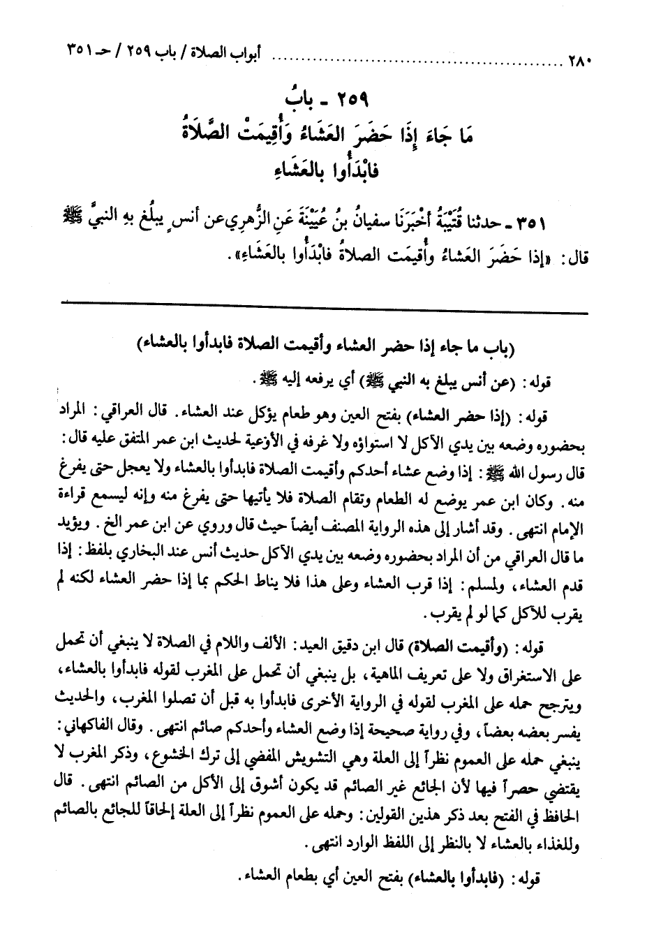 وَيُؤَيِّدُ مَا قَالَ الْعِرَاقِيُّ مِنْ أَنَّ الْمُرَادَ بِحُضُورِهِ وَضْعُهُ بَيْنَ يَدَيِ الْآكِلِ حَدِيثُ أَنَسٍ عِنْدَ الْبُخَارِيِّ بِلَفْظِ إِذَا قُدِّمَ الْعَشَاءُ وَلِمُسْلِمٍ إِذَا قُرِّبَ الْعَشَاءُ وَعَلَى هَذَا فَلَا يُنَاطُ الْحُكْمُ بِمَا إِذَا حَضَرَ الْعَشَاءُ لَكِنَّهُ لَمْ يُقَرَّبْ لِلْآكِلِ كَمَا لَوْ لَمْ يقرب