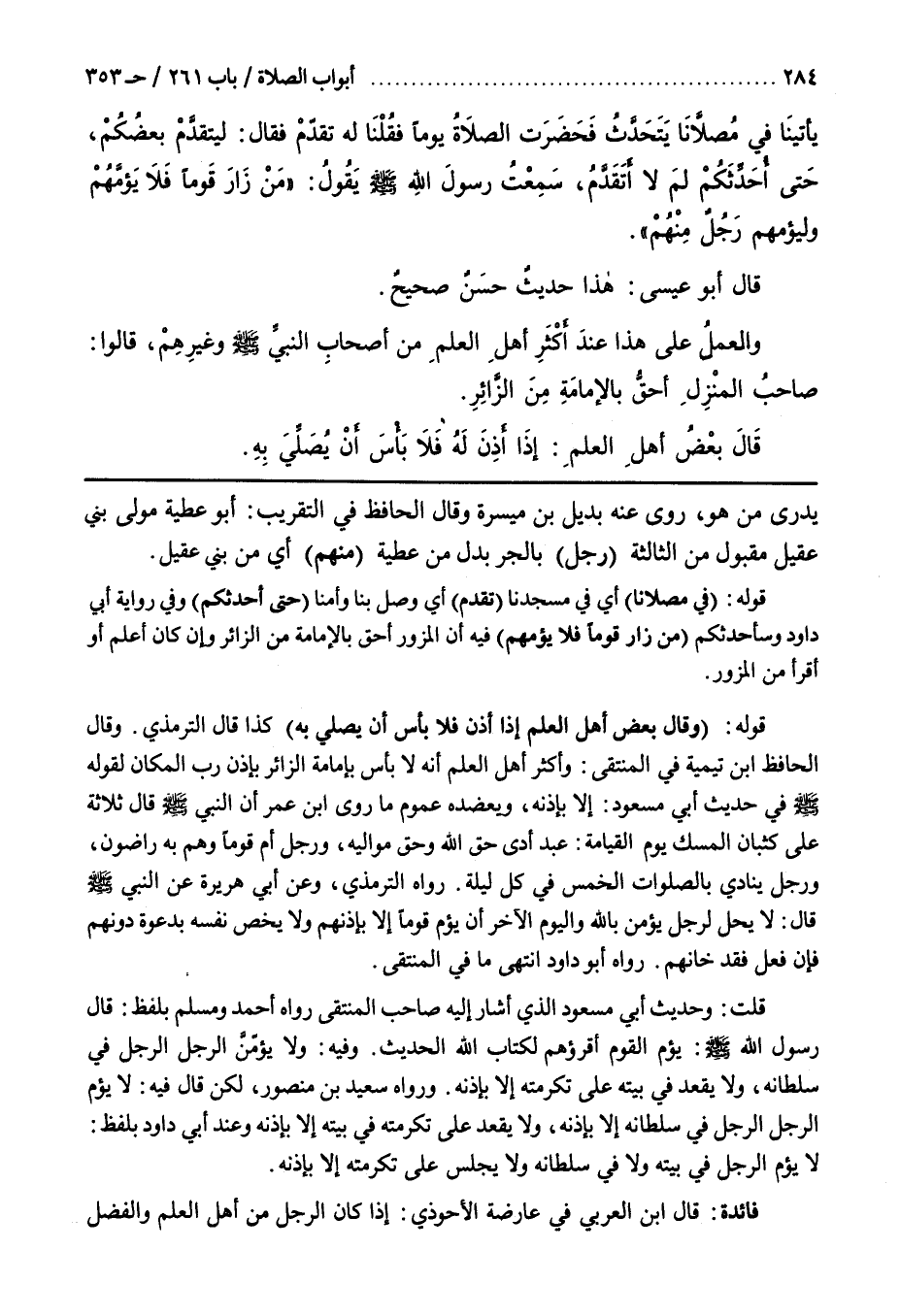 وقال الحافظ بن تَيْمِيَةَ فِي الْمُنْتَقَى وَأَكْثَرُ أَهْلِ الْعِلْمِ أَنَّهُ لَا بَأْسَ بِإِمَامَةِ الزَّائِرِ بِإِذْنِ رَبِّ الْمَكَانِ لِقَوْلِهِ صَلَّى اللَّهُ عَلَيْهِ وَسَلَّمَ فِي حَدِيثِ أَبِي مَسْعُودٍ إِلَّا بِإِذْنِهِ وَيُعَضِّدُهُ عُمُومُ مَا روى بن عُمَرَ أَنَّ النَّبِيَّ صَلَّى اللَّهُ عَلَيْهِ وَسَلَّمَ قَالَ ثَلَاثَةٌ عَلَى كُثْبَانِ الْمِسْكِ يَوْمَ الْقِيَامَةِ عَبْدٌ أَدَّى حَقَّ اللَّهِ وَحَقَّ مَوَالِيهِ وَرَجُلٌ أَمَّ قَوْمًا وَهُمْ بِهِ رَاضُونَ وَرَجُلٌ يُنَادِي بِالصَّلَوَاتِ الْخَمْسِ فِي كُلِّ لَيْلَةٍ