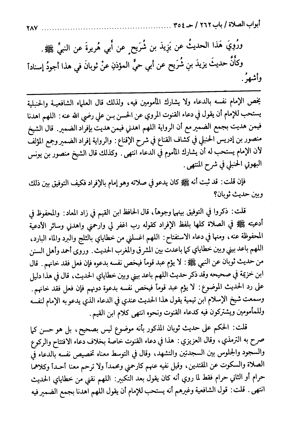 فَإِنْ قُلْتَ قَدْ ثَبَتَ أَنَّهُ صَلَّى اللَّهُ عَلَيْهِ وَسَلَّمَ كَانَ يَدْعُو فِي صَلَاتِهِ وَهُوَ إِمَامٌ بِالْإِفْرَادِ فَكَيْفَ التَّوْفِيقُ بَيْنَ ذَلِكَ وَبَيْنَ حَدِيثِ ثَوْبَانَ قُلْتُ ذَكَرُوا فِي التَّوْفِيقِ بَيْنَهُمَا وُجُوهًا قَالَ الْحَافِظُ بن الْقَيِّمِ فِي زَادِ الْمَعَادِ وَالْمَحْفُوظُ فِي أَدْعِيَتِهِ صَلَّى اللَّهُ عَلَيْهِ وَسَلَّمَ فِي الصَّلَاةِ كُلِّهَا بِلَفْظِ الْإِفْرَادِ كَقَوْلِهِ رَبِّ اغْفِرْ لِي وَارْحَمْنِي وَاهْدِنِي وَسَائِرُ الْأَدْعِيَةِ الْمَحْفُوظَةِ عَنْهُ وَمِنْهَا قَوْلُهُ فِي دُعَاءِ الِاسْتِفْتَاحِ اللَّهُمَّ اغْسِلْنِي مِنْ خَطَايَايَ بِالثَّلْجِ وَالْبَرَدِ وَالْمَاءِ الْبَارِدِ اللَّهُمَّ بَاعِدْ بَيْنِي وَبَيْنَ خَطَايَايَ كَمَا بَاعَدْتَ بَيْنَ الْمَشْرِقِ وَالْمَغْرِبِ الْحَدِيثَ