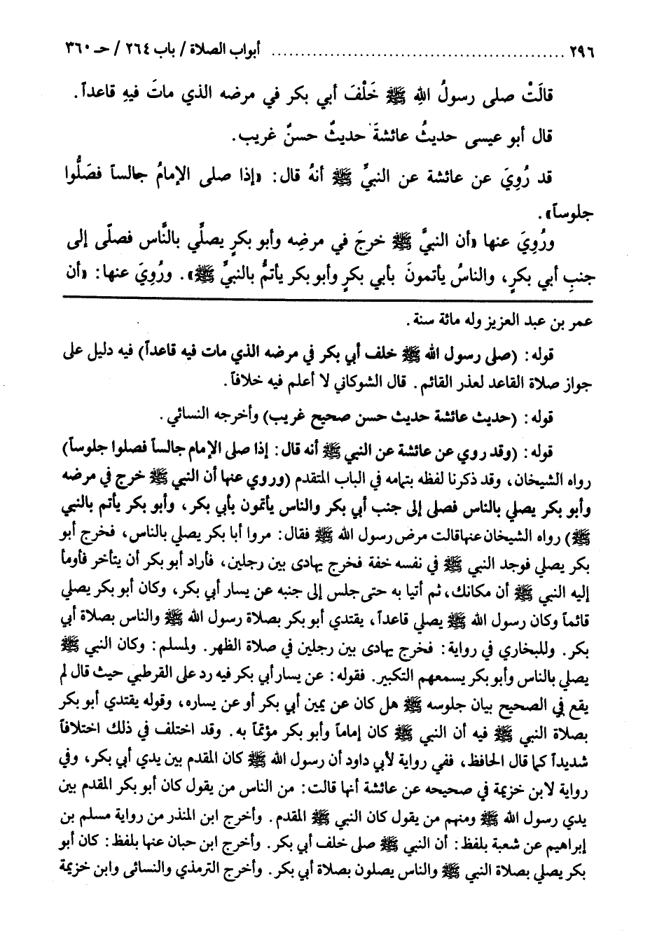 قَوْلُهُ وَقَدْ رُوِيَ عَنْ عَائِشَةَ عَنِ النَّبِيِّ صَلَّى اللَّهُ عَلَيْهِ وَسَلَّمَ أَنَّهُ قَالَ إِذَا صَلَّى الْإِمَامُ جَالِسًا فَصَلُّوا جُلُوسًا رَوَاهُ الشَّيْخَانِ وَقَدْ ذَكَرْنَا لَفْظَهُ بِتَمَامِهِ فِي الْبَابِ الْمُتَقَدِّمِ (وَرُوِيَ عَنْهَا أَنَّ النَّبِيَّ صَلَّى اللَّهُ عَلَيْهِ وَسَلَّمَ خَرَجَ فِي مَرَضِهِ وَأَبُو بَكْرٍ يُصَلِّي بِالنَّاسِ فَصَلَّى إِلَى جَنْبِ أَبِي بَكْرٍ وَالنَّاسُ يَأْتَمُّونَ بِأَبِي بَكْرٍ وَأَبُو بَكْرٍ يَأْتَمُّ بِالنَّبِيِّ صَلَّى الله عليه وسلم) رواه الشيخان عنها قال مَرِضَ رَسُولُ اللَّهِ صَلَّى اللَّهُ عَلَيْهِ وَسَلَّمَ فَقَالَ مُرُوا أَبَا بَكْرٍ يُصَلِّي بِالنَّاسِ فَخَرَجَ أَبُو بَكْرٍ يُصَلِّي فَوَجَدَ النَّبِيُّ صَلَّى اللَّهُ عَلَيْهِ وَسَلَّمَ فِي نَفْسِهِ خِفَّةً فَخَرَجَ يُهَادَى بَيْنَ رَجُلَيْنِ فَأَرَادَ أَبُو بَكْرٍ أَنْ يَتَأَخَّرَ فَأَوْمَأَ إِلَيْهِ النَّبِيُّ صَلَّى اللَّهُ عَلَيْهِ وَسَلَّمَ أن مكانك ثم أتيابه حَتَّى جَلَسَ إِلَى جَنْبِهِ عَنْ يَسَارِ أَبِي بَكْرٍ وَكَانَ أَبُو بَكْرٍ يُصَلِّي قَائِمًا وَكَانَ رَسُولُ اللَّهِ صَلَّى اللَّهُ عَلَيْهِ وَسَلَّمَ يصلي قَاعِدًا يَقْتَدِي أَبُو بَكْرٍ بِصَلَاةِ رَسُولِ اللَّهِ صَلَّى اللَّهُ عَلَيْهِ وَسَلَّمَ وَالنَّاسُ بِصَلَاةِ أَبِي بَكْرٍ