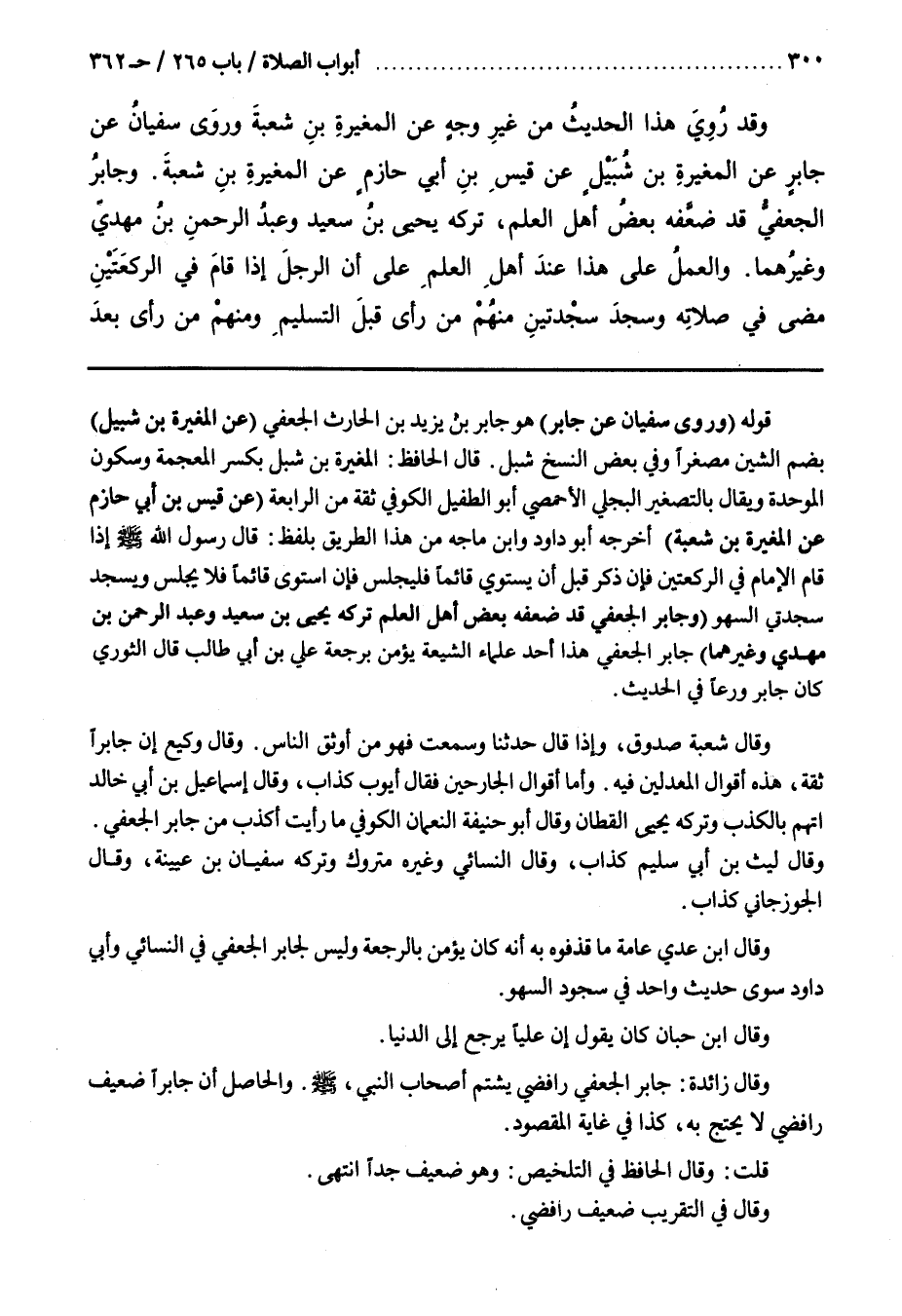 قَالَ الْحَافِظُ الْمُغِيرَةُ بْنُ شِبْلٍ بِكَسْرِ الْمُعْجَمَةِ وَسُكُونِ الْمُوَحَّدَةِ وَيُقَالُ بِالتَّصْغِيرِ الْبَجَلِيُّ الأحمصي أَبُو الطُّفَيْلِ الْكُوفِيُّ ثِقَةٌ مِنَ الرَّابِعَةِ (عَنْ قَيْسِ بْنِ أَبِي حَازِمٍ عَنِ الْمُغِيرَةِ بْنِ شُعْبَةَ أَخْرَجَهُ أَبُو دَاوُدَ وبن مَاجَهْ مِنْ هَذَا الطَّرِيقِ) بِلَفْظِ قَالَ رَسُولُ اللَّهِ صَلَّى اللَّهُ عَلَيْهِ وَسَلَّمَ إِذَا قَامَ الْإِمَامُ فِي الرَّكْعَتَيْنِ فَإِنْ ذَكَرَ قَبْلَ أَنْ يَسْتَوِيَ قَائِمًا فَلْيَجْلِسْ فَإِنِ اسْتَوَى قَائِمًا فَلَا يجلس ويسجد سَجْدَتَيِ السَّهْوِ وَجَابِرٌ الْجُعْفِيُّ قَدْ ضَعَّفَهُ بَعْضُ أَهْلِ الْعِلْمِ تَرَكَهُ يَحْيَى بْنُ سَعِيدٍ وَعَبْدُ الرحمن المهدي وَغَيْرُهُمَا جَابِرٌ الْجُعْفِيُّ هَذَا أَحَدُ عُلَمَاءِ الشِّيعَةِ يُؤْمِنُ بِرَجْعَةِ عَلِيِّ بْنِ أَبِي طَالِبٍ قَالَ الثَّوْرِيُّ كَانَ جَابِرٌ وَرِعًا فِي الْحَدِيثِ