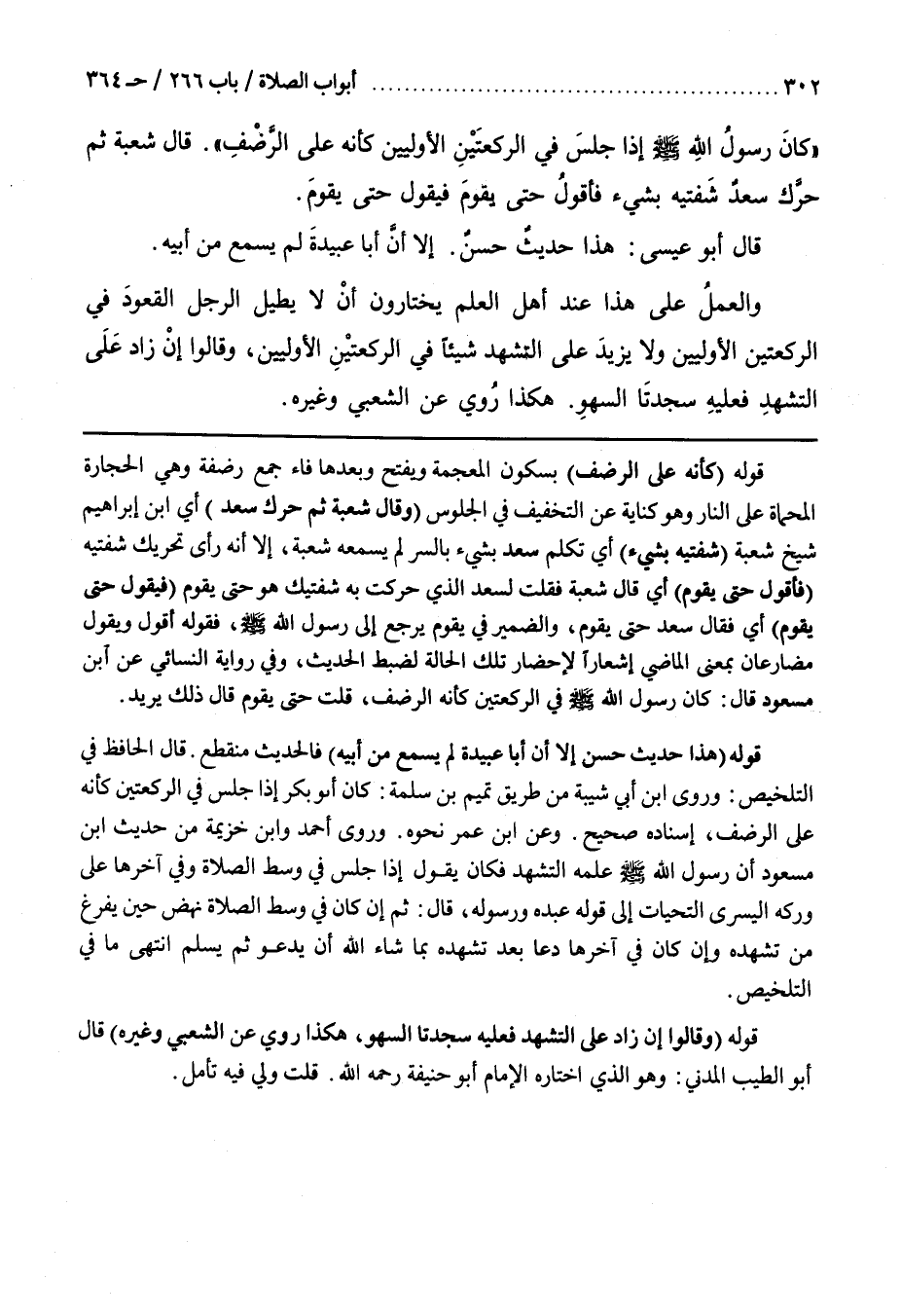 قَوْلُهُ (كَأَنَّهُ عَلَى الرَّضْفِ) بِسُكُونِ الْمُعْجَمَةِ وَبِفَتْحٍ وَبَعْدَهَا فَاءٌ جَمْعُ رَضْفَةٍ وَهِيَ الْحِجَارَةُ الْمُحْمَاةُ عَلَى النَّارِ وَهُوَ كِنَايَةٌ عَنِ التَّخْفِيفِ فِي الْجُلُوسِ وَقَالَ شُعْبَةُ ثُمَّ حَرَّكَ سَعْدٌ أَيِ بن إِبْرَاهِيمَ شَيْخُ شُعْبَةَ (شَفَتَيْهِ بِشَيْءٍ) أَيْ تَكَلَّمَ سَعْدٌ بِشَيْءٍ بِالسِّرِّ لَمْ يَسْمَعْهُ شُعْبَةُ إِلَّا أَنَّهُ رَأَى تَحْرِيكَ شَفَتَيْهِ (فَأَقُولُ حَتَّى يَقُومَ) أَيْ قَالَ شُعْبَةُ فَقُلْتُ لِسَعْدٍ الَّذِي حَرَّكْتَ بِهِ شَفَتَيْهِ هُوَ مَتَى يَقُومُ (فَيَقُولُ حَتَّى يَقُومَ) أَيْ فَقَالَ سَعْدٌ حَتَّى يَقُومَ وَالضَّمِيرُ فِي يَقُومُ يَرْجِعُ إِلَى رَسُولِ اللَّهِ صَلَّى اللَّهُ عَلَيْهِ وَسَلَّمَ فقوله أقول وَيَقُولُ مُضَارِعَانِ بِمَعْنَى الْمَاضِي إِشْعَارًا لِإِحْضَارِ تِلْكَ الْحَالَةِ لِضَبْطِ الْحَدِيثِ وَفِي رِوَايَةِ النَّسَائِيِّ عَنِ بْنِ مَسْعُودٍ قَالَ كَانَ رَسُولُ اللَّهِ صَلَّى اللَّهُ عَلَيْهِ وَسَلَّمَ فِي الرَّكْعَتَيْنِ كَأَنَّهُ عَلَى الرَّضْفِ قُلْتُ حَتَّى يَقُومَ قَالَ ذَلِكَ يُرِيدُ