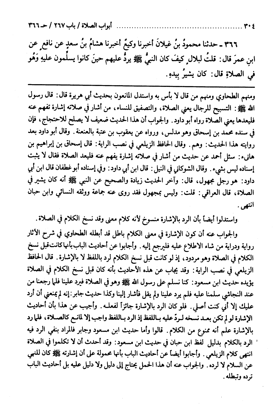 قَالَ الْحَافِظُ الزَّيْلَعِيُّ فِي نَصْبِ الرَّايَةِ وَقَدْ يُجَابُ عَنْ هَذِهِ الْأَحَادِيثِ بِأَنَّهُ كَانَ قَبْلَ نَسْخِ الْكَلَامِ فِي الصَّلَاةِ يؤيده حديث بن مَسْعُودٍ كُنَّا نُسَلِّمُ عَلَى رَسُولِ اللَّهِ صَلَّى اللَّهُ عَلَيْهِ وَسَلَّمَ وَهُوَ فِي الصَّلَاةِ فَيَرُدُّ عَلَيْنَا فَلَمَّا رَجَعْنَا مِنْ عِنْدِ النَّجَاشِيِّ سَلَّمْنَا عَلَيْهِ فَلَمْ يَرُدَّ عَلَيْنَا وَلَمْ يَقُلْ فَأَشَارَ إِلَيْنَا وَكَذَا حَدِيثُ جَابِرٍ أَنَّهُ لَمْ يَمْنَعْنِي أَنْ أَرُدَّ عَلَيْكَ إِلَّا أَنِّي كُنْتُ أُصَلِّي