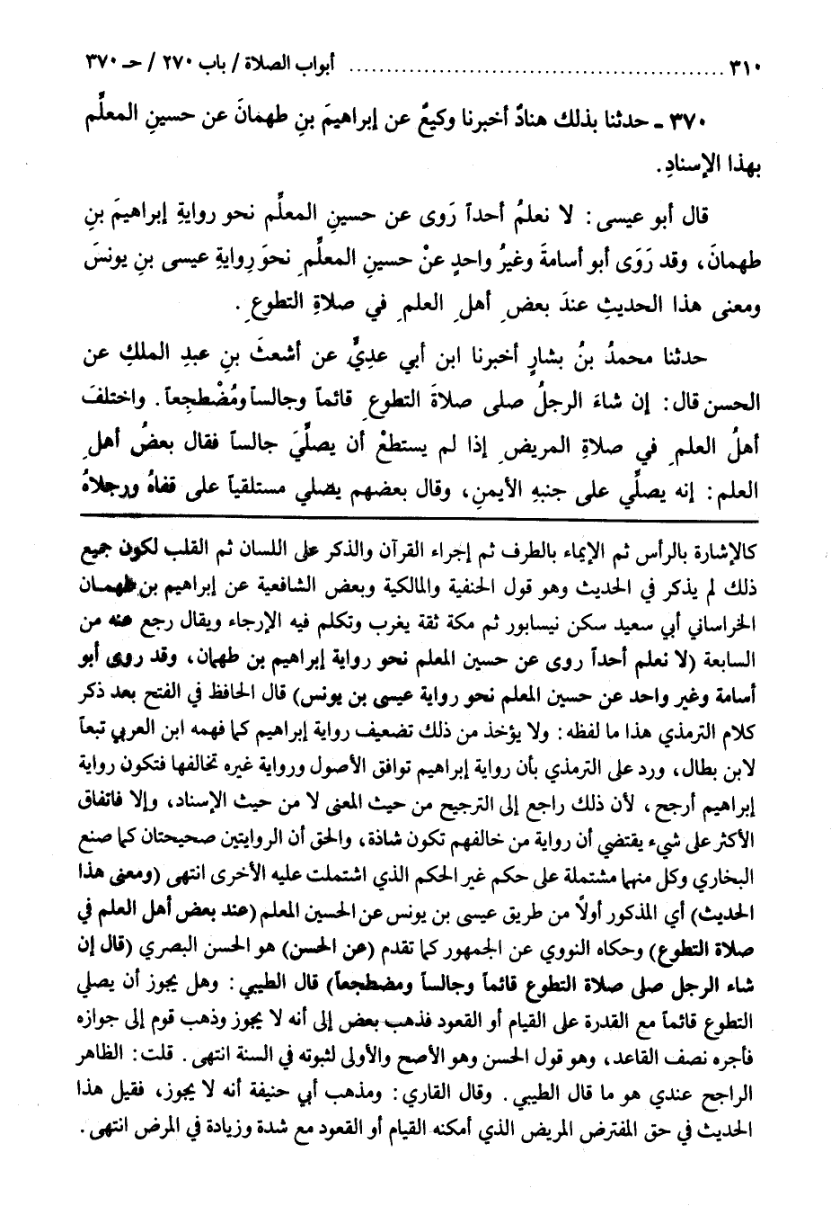 كالإ شارة بِالرَّأْسِ ثُمَّ الْإِيمَاءِ بِالطَّرْفِ ثُمَّ إِجْرَاءِ الْقُرْآنِ وَالذِّكْرِ عَلَى اللِّسَانِ ثُمَّ الْقَلْبِ لِكَوْنِ جَمِيعِ ذَلِكَ لَمْ يُذْكَرْ فِي الْحَدِيثِ وَهُوَ قَوْلُ الْحَنَفِيَّةِ وَالْمَالِكِيَّةِ وَبَعْضِ الشَّافِعِيَّةِ عَنْ إِبْرَاهِيمَ بْنِ طهمان الخرساني أَبِي سَعِيدٍ سَكَنَ نَيْسَابُورَ ثُمَّ مَكَّةَ ثِقَةٌ يغرب وتكلم فيه الارجاء وَيُقَالُ رَجَعَ عَنْهُ مِنَ السَّابِعَةِ [372] (لَا نَعْلَمُ أَحَدًا رَوَى عَنْ حُسَيْنٍ الْمُعَلِّمِ نَحْوَ رِوَايَةِ إِبْرَاهِيمَ بْنِ طَهْمَانَ وَقَدْ رَوَى أَبُو أُسَامَةَ وَغَيْرُ وَاحِدٍ عَنْ حُسَيْنٍ الْمُعَلِّمِ نَحْوَ رِوَايَةِ عِيسَى بْنِ يُونُسَ) قَالَ الْحَافِظُ فِي الْفَتْحِ بَعْدَ ذِكْرِ كَلَامِ التِّرْمِذِيِّ هَذَا مَا لَفْظُهُ وَلَا يُؤْخَذُ مِنْ ذَلِكَ تَضْعِيفُ رِوَايَةِ إِبْرَاهِيمَ كما فهمه بن الْعَرَبِيِّ تَبَعًا لِابْنِ بَطَّالٍ وَرُدَّ عَلَى التِّرْمِذِيِّ بِأَنَّ رِوَايَةَ إِبْرَاهِيمَ تُوَافِقُ الْأُصُولَ وَرِوَايَةَ غَيْرِهِ تُخَالِفُهَا فَتَكُونُ رِوَايَةُ إِبْرَاهِيمَ أَرْجَحَ لِأَنَّ ذَلِكَ رَاجِعٌ إِلَى التَّرَجُّحِ مِنْ حَيْثُ الْمَعْنَى لَا مِنْ حَيْثُ الْإِسْنَادُ وَإِلَّا فَاتِّفَاقُ الْأَكْثَرِ عَلَى شَيْءٍ يَقْتَضِي أَنَّ رِوَايَةَ مَنْ خَالَفَهُمْ تَكُونُ شَاذَّةً وَالْحَقُّ أَنَّ الرِّوَايَتَيْنِ صَحِيحَتَانِ كَمَا صَنَعَ الْبُخَارِيُّ وَكُلٌّ مِنْهُمَا مُشْتَمِلَةٌ عَلَى حُكْمٍ غَيْرِ الْحُكْمِ الَّذِي اشْتَمَلَتْ عَلَيْهِ الْأُخْرَى انْتَهَى قَوْلُهُ (وَمَعْنَى هَذَا الْحَدِيثِ) أَيِ الْمَذْكُورِ أَوَّلًا مِنْ طَرِيقِ عِيسَى بْنِ يُونُسَ عَنِ الْحُسَيْنِ الْمُعَلِّمِ (عِنْدَ بَعْضِ أَهْلِ الْعِلْمِ فِي صَلَاةِ التَّطَوُّعِ) وحكاه النَّوَوِيُّ عَنِ الْجُمْهُورِ كَمَا تَقَدَّمَ (عَنِ الْحَسَنِ) هُوَ الْحَسَنُ الْبَصْرِيُّ (قَالَ إِنْ شَاءَ الرَّجُلُ صَلَّى صَلَاةَ التَّطَوُّعِ قَائِمًا وَجَالِسًا وَمُضْطَجِعًا) قَالَ الطيبي وهل يجوز أن يصلي التطوع قائما مَعَ الْقُدْرَةِ عَلَى الْقِيَامِ أَوِ الْقُعُودِ فَذَهَبَ بَعْضٌ إِلَى أَنَّهُ لَا يَجُوزُ وَذَهَبَ قَوْمٌ إِلَى جَوَازِهِ فَأَجْرُهُ نِصْفُ الْقَاعِدِ وَهُوَ قَوْلُ الْحَسَنِ وَهُوَ الْأَصَحُّ وَالْأَوْلَى لِثُبُوتِهِ فِي السُّنَّةِ انْتَهَى