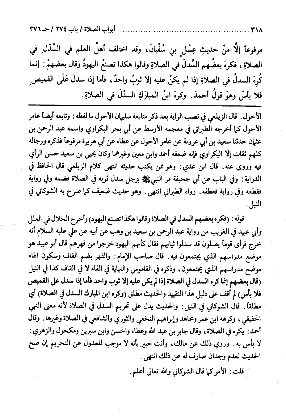 قَالَ الشَّوْكَانِيُّ فِي النَّيْلِ وَالْحَدِيثُ يَدُلُّ عَلَى تَحْرِيمِ السَّدْلِ فِي الصَّلَاةِ لِأَنَّهُ مَعْنَى النَّهْيِ الْحَقِيقِيِّ وكرهه بن عُمَرَ وَمُجَاهِدٌ وَإِبْرَاهِيمُ النَّخَعِيُّ وَالثَّوْرِيُّ وَالشَّافِعِيُّ فِي الصَّلَاةِ وَغَيْرِهَا