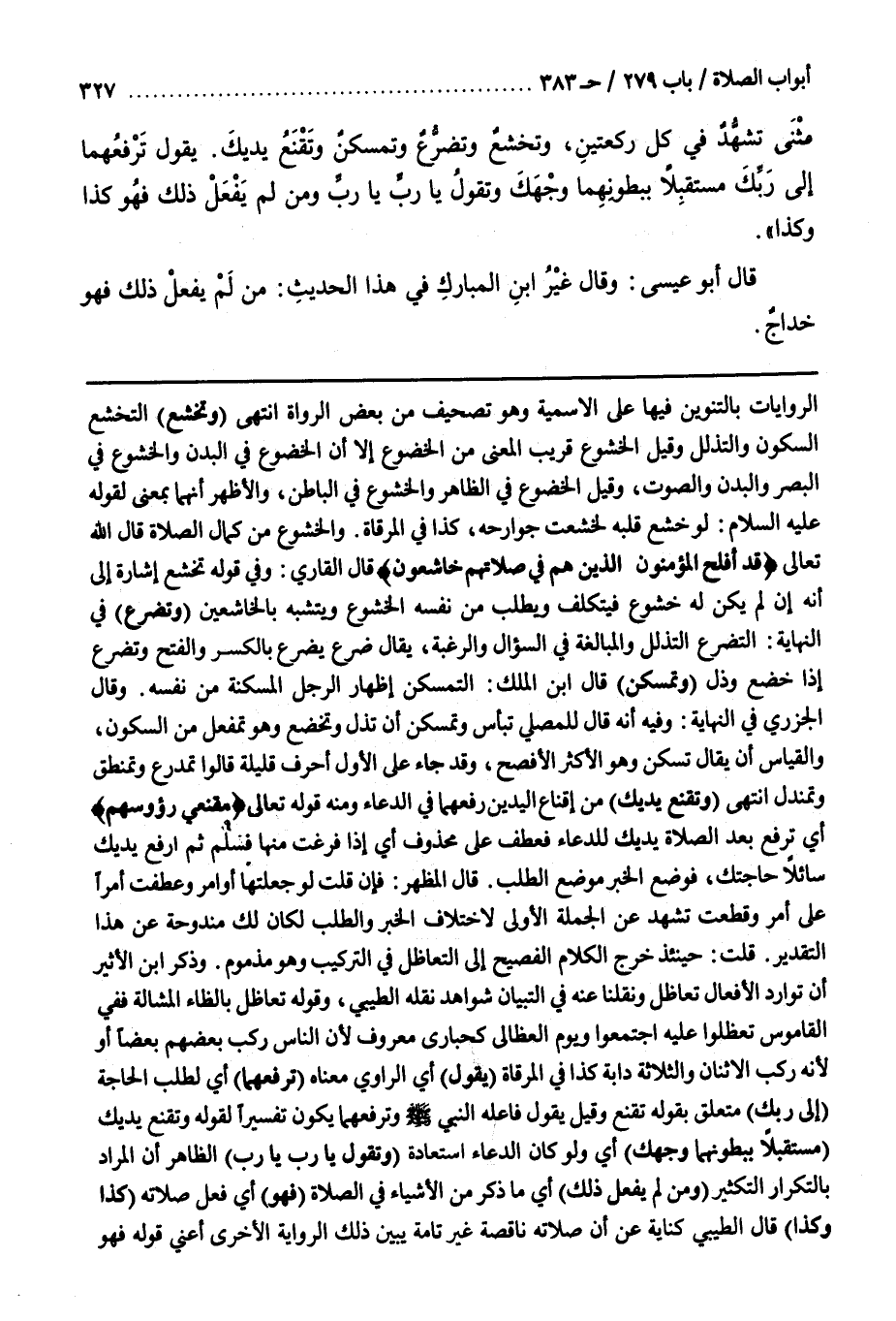 وَالْخُشُوعُ مِنْ كَمَالِ الصَّلَاةِ قَالَ اللَّهُ تَعَالَى قَدْ أَفْلَحَ الْمُؤْمِنُونَ الَّذِينَ هُمْ فِي صَلَاتِهِمْ خاشعون قال القارىء وَفِي قَوْلِهِ تَخَشُّعٌ إِشَارَةٌ إِلَى أَنَّهُ إِنْ لَمْ يَكُنْ لَهُ خُشُوعٌ فَيَتَكَلَّفُ وَيَطْلُبُ مِنْ نَفْسِهِ الْخُشُوعَ وَيَتَشَبَّهُ بِالْخَاشِعِينَ (وَتَضَرُّعٌ) فِي النِّهَايَةِ التَّضَرُّعُ التَّذَلُّلُ وَالْمُبَالَغَةُ فِي السُّؤَالِ وَالرَّغْبَةِ يُقَالُ ضَرَعَ يَضْرَعُ بِالْكَسْرِ وَالْفَتْحِ وَتَضَرَّعَ إِذَا خَضَعَ وذل (وتمسكن) قال بن الْمَلَكِ التَّمَسْكُنُ إِظْهَارُ الرَّجُلِ الْمَسْكَنَةَ مِنْ نَفْسِهِ