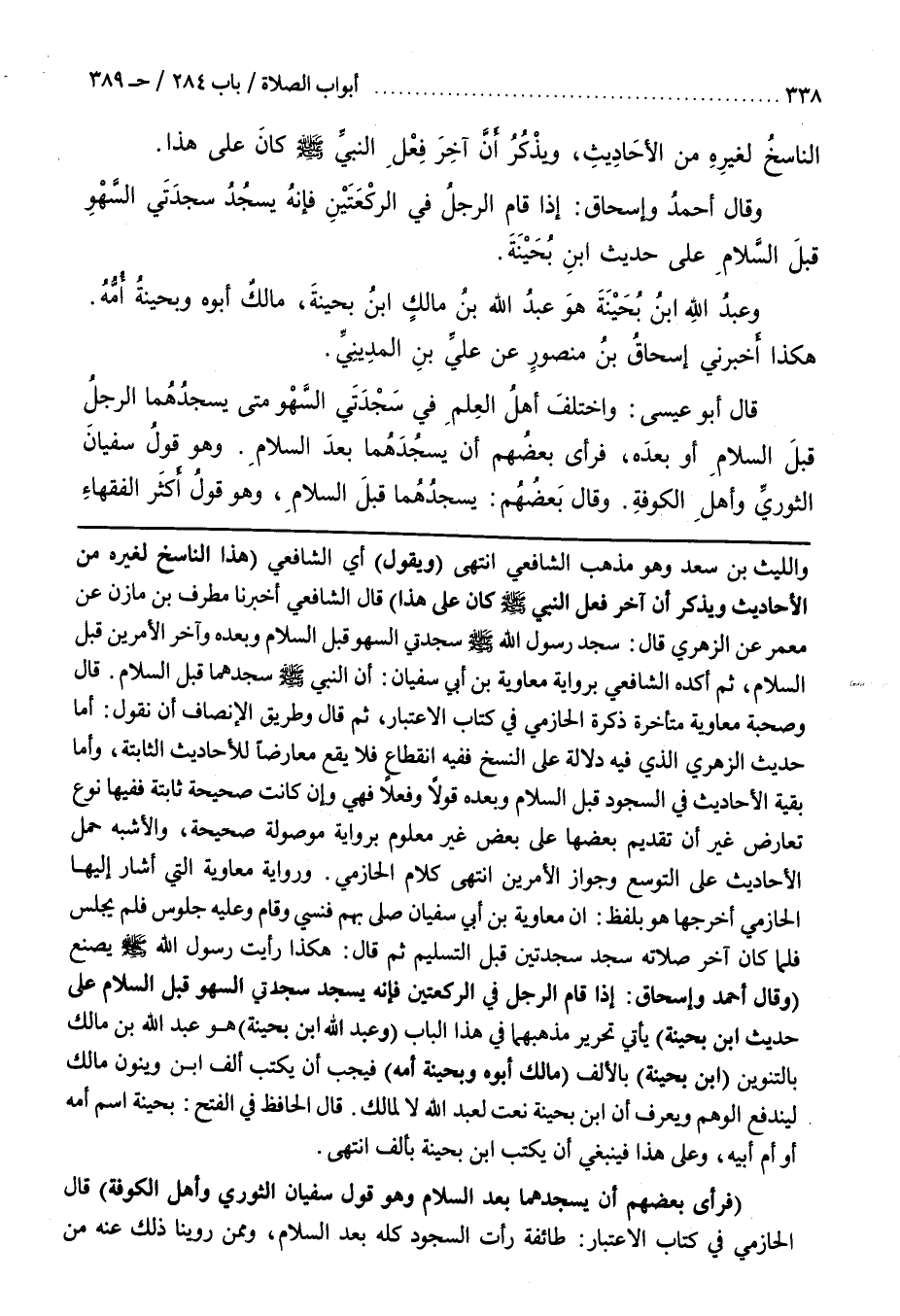 وَرِوَايَةُ مُعَاوِيَةَ الَّتِي أَشَارَ إِلَيْهَا الْحَازِمِيُّ أَخْرَجَهَا هُوَ بِلَفْظِ إِنَّ مُعَاوِيَةَ بْنَ أَبِي سُفْيَانَ صَلَّى بِهِمْ فَنَسِيَ وَقَامَ وَعَلَيْهِ جُلُوسٌ فَلَمْ يَجْلِسْ فَلَمَّا كَانَ آخِرُ صَلَاتِهِ سَجَدَ سَجْدَتَيْنِ قَبْلَ التَّسْلِيمِ ثُمَّ قَالَ هَكَذَا رَأَيْتُ رَسُولَ اللَّهِ صَلَّى اللَّهُ عَلَيْهِ وَسَلَّمَ يَصْنَعُ (وَقَالَ أَحْمَدُ وَإِسْحَاقُ إِذَا قَامَ الرَّجُلُ فِي الرَّكْعَتَيْنِ فإنه يسجد سجدتين السهو قبل السلام على حديث بن بُحَيْنَةَ) يَأْتِي تَحْرِيرُ مَذْهَبِهِمَا فِي هَذَا الْكِتَابِ (وعبد الله بن بحينة) هو وعبد الله بن مالك بالتنوين (بن بُحَيْنَةَ) بِالْأَلِفِ (مَالِكٌ أَبُوهُ وَبُحَيْنَةُ أُمُّهُ) فَيَجِبُ أن يكتب ألف بن وينون مالك ليندفع الوهم ويعرف أن بن بُحَيْنَةَ نَعْتٌ لِعَبْدِ اللَّهِ لَا لِمَالِكٍ قَالَ الْحَافِظُ فِي الْفَتْحِ بُحَيْنَةُ اسْمُ أُمِّهِ أَوْ أُمِّ أَبِيهِ وَعَلَى هَذَا فَيَنْبَغِي أَنْ يُكْتَبَ بن بُحَيْنَةَ بِأَلِفٍ انْتَهَى