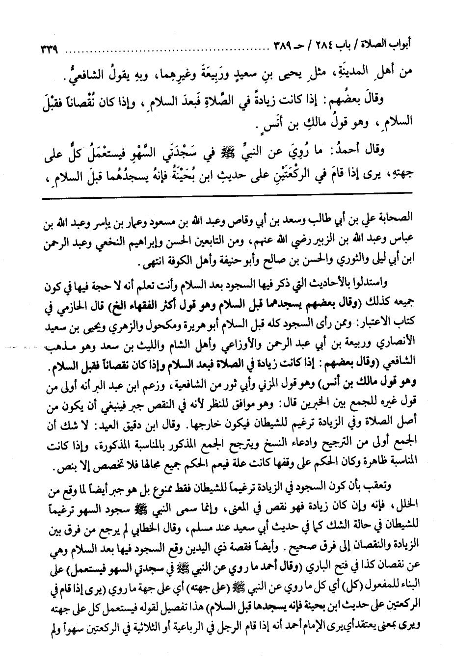 وَأَيْضًا فَقِصَّةُ ذِي الْيَدَيْنِ وَقَعَ السُّجُودُ فِيهَا بَعْدَ السَّلَامِ وَهِيَ عَنْ نُقْصَانٍ كَذَا فِي فَتْحِ الْبَارِي (وَقَالَ أَحْمَدُ مَا رُوِيَ عَنِ النَّبِيِّ صَلَّى اللَّهُ عَلَيْهِ وَسَلَّمَ فَيُسْتَعْمَلُ) عَلَى الْبِنَاءِ لِلْمَفْعُولِ (كُلٌّ) أَيْ كُلُّ مَا رُوِيَ عَنِ النَّبِيِّ صَلَّى اللَّهُ عَلَيْهِ وَسَلَّمَ (عَلَى جِهَتِهِ) أَيْ عَلَى جِهَةِ مَا رُوِيَ (يَرَى إِذَا قام في الركعتين على حديث بن بُحَيْنَةَ فَإِنَّهُ يَسْجُدُهَا قَبْلَ السَّلَامِ) هَذَا تَفْصِيلٌ لِقَوْلِهِ فَيُسْتَعْمَلُ كُلٌّ عَلَى جِهَتِهِ وَيَرَى بِمَعْنَى يَعْتَقِدُ أَنْ يَرَى الْإِمَامُ أَحْمَدُ أَنَّهُ إِذَا قَامَ الرَّجُلُ فِي الرُّبَاعِيَّةِ أَوِ الثُّلَاثِيَّةِ فِي الرَّكْعَتَيْنِ سَهْوًا وَلَمْ