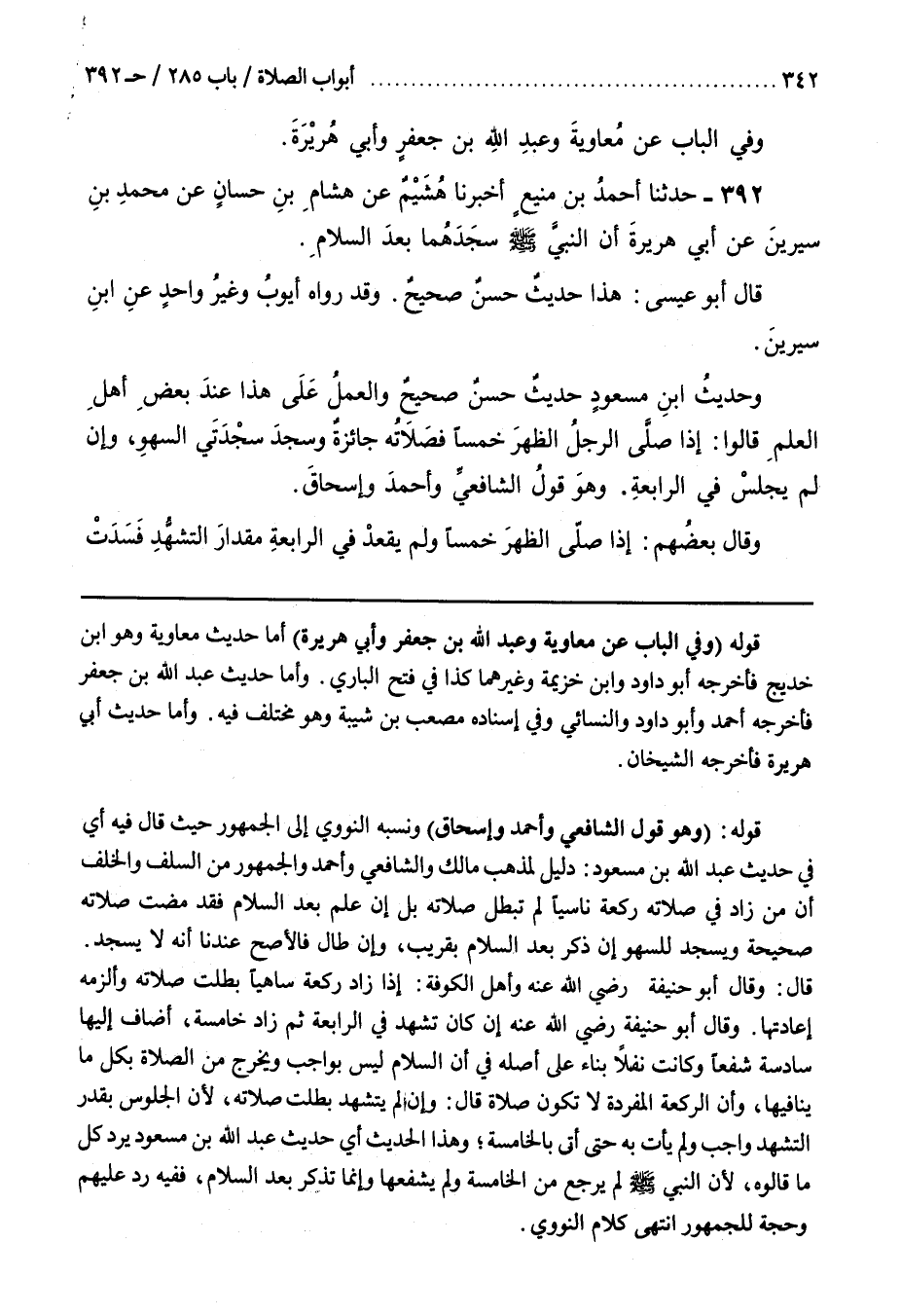 [394] قَوْلُهُ (وَهُوَ قَوْلُ الشَّافِعِيِّ وَأَحْمَدَ وَإِسْحَاقَ) وَنَسَبَهُ النَّوَوِيُّ إِلَى الْجُمْهُورِ حَيْثُ قَالَ فِيهِ أَيْ فِي حَدِيثِ عَبْدِ اللَّهِ بْنِ مَسْعُودٍ دَلِيلٌ لِمَذْهَبِ مَالِكٍ وَالشَّافِعِيِّ وَأَحْمَدَ وَالْجُمْهُورِ مِنَ السَّلَفِ وَالْخَلَفِ أَنَّ مَنْ زَادَ فِي صَلَاتِهِ رَكْعَةً نَاسِيًا لَمْ تَبْطُلْ صَلَاتُهُ بَلْ إِنْ عَلِمَ بَعْدَ السَّلَامِ فَقَدْ مَضَتْ صَلَاتُهُ صَحِيحَةً وَيَسْجُدُ لِلسَّهْوِ إِنْ ذَكَرَ بَعْدَ السَّلَامِ بِقَرِيبٍ وَإِنْ طَالَ فَالْأَصَحُّ عِنْدَنَا أَنَّهُ لا يسجد