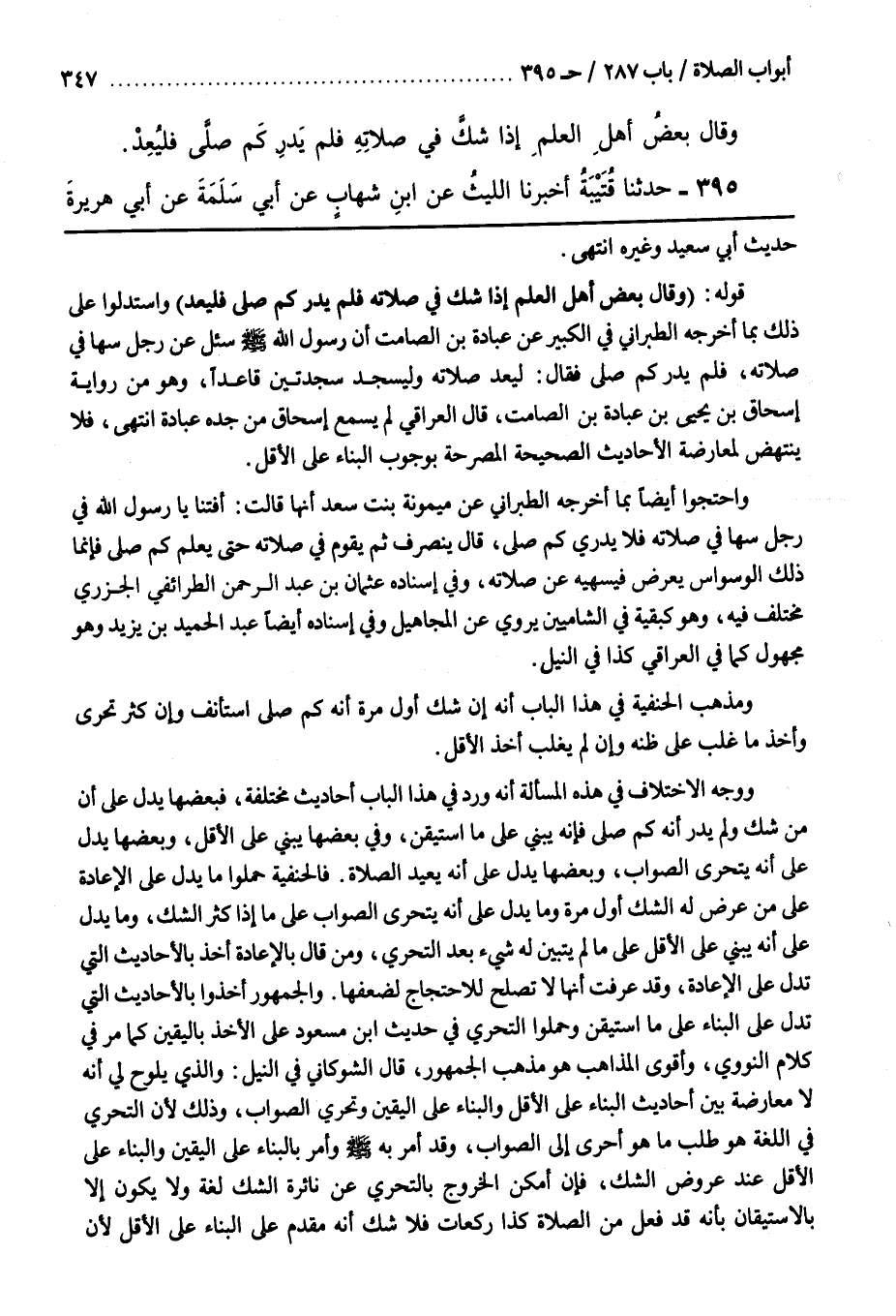 فَالْحَنَفِيَّةُ حَمَلُوا مَا يَدُلُّ عَلَى الْإِعَادَةِ عَلَى مَنْ عَرَضَ لَهُ الشَّكُّ أَوَّلَ مَرَّةٍ وَمَا يَدُلُّ عَلَى أَنَّهُ يَتَحَرَّى الصَّوَابَ عَلَى مَا إِذَا كَثُرَ الشَّكُّ وَمَا يَدُلُّ عَلَى أَنَّهُ يَبْنِي عَلَى الْأَقَلِّ عَلَى مَا لَمْ يَتَبَيَّنْ لَهُ شَيْءٌ بَعْدَ التَّحَرِّي وَمَنْ قَالَ بِالْإِعَادَةِ أَخَذَ بِالْأَحَادِيثِ الَّتِي تَدُلُّ عَلَى الْإِعَادَةِ وَقَدْ عَرَفْتَ أَنَّهَا لَا تَصْلُحُ لِلِاحْتِجَاجِ لِضَعْفِهَا وَالْجُمْهُورُ أَخَذُوا بِالْأَحَادِيثِ الَّتِي تَدُلُّ عَلَى الْبِنَاءِ عَلَى مَا اسْتَيْقَنَ وَحَمَلُوا التَّحَرِّيَ في حديث بن مَسْعُودٍ عَلَى الْأَخْذِ بِالْيَقِينِ كَمَا مَرَّ فِي كَلَامِ النَّوَوِيِّ وَأَقْوَى الْمَذَاهِبِ هُوَ مَذْهَبُ الْجُمْهُورِ قَالَ الشَّوْكَانِيُّ فِي النَّيْلِ وَالَّذِي يَلُوحُ لِي أَنَّهُ لَا مُعَارَضَةَ بَيْنَ أَحَادِيثِ الْبِنَاءِ عَلَى الْأَقَلِّ وَالْبِنَاءِ عَلَى الْيَقِينِ وَتَحَرِّي الصَّوَابِ وَذَلِكَ لِأَنَّ التَّحَرِّيَ فِي اللُّغَةِ هُوَ طَلَبُ مَا هُوَ أَحْرَى إِلَى الصَّوَابِ وَقَدْ أَمَرَ بِهِ صَلَّى اللَّهُ عَلَيْهِ وَسَلَّمَ وَأَمَرَ بِالْبِنَاءِ عَلَى الْيَقِينِ وَالْبِنَاءِ عَلَى الْأَقَلِّ عِنْدَ عُرُوضِ الشَّكِّ فإن أمكن الخروج بالتحري عن ثائرة الشَّكِّ لُغَةً وَلَا يَكُونُ إِلَّا بِالِاسْتِيقَانِ بِأَنَّهُ قَدْ فَعَلَ مِنَ الصَّلَاةِ كَذَا رَكَعَاتٍ فَلَا شَكَّ أَنَّهُ مُقَدَّمٌ عَلَى الْبِنَاءِ عَلَى الْأَقَلِّ لأن