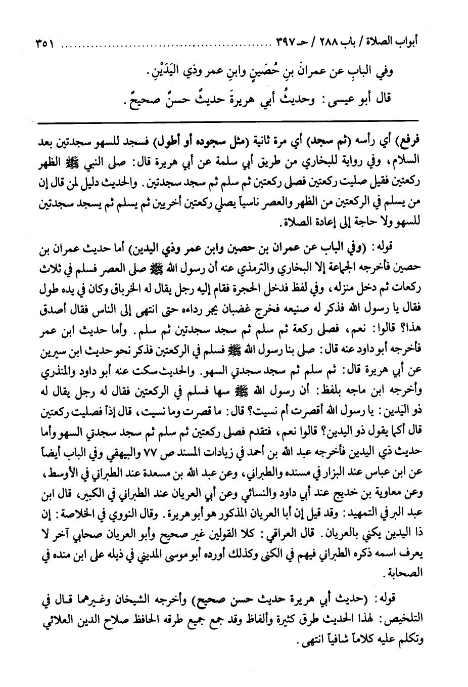 قَوْلُهُ (وَفِي الْبَابِ عَنْ عِمْرَانَ بْنِ حُصَيْنٍ وبن عُمَرَ وَذِي الْيَدَيْنِ) أَمَّا حَدِيثُ عِمْرَانَ بْنِ حُصَيْنٍ فَأَخْرَجَهُ الْجَمَاعَةُ إِلَّا الْبُخَارِيَّ وَالتِّرْمِذِيَّ عَنْهُ أَنَّ رَسُولَ اللَّهِ صَلَّى اللَّهُ عَلَيْهِ وسلم صلى العصر فسلم في ثلاثة رَكَعَاتٍ ثُمَّ دَخَلَ مَنْزِلَهُ وَفِي لَفْظٍ فَدَخَلَ الْحُجْرَةَ فَقَامَ إِلَيْهِ رَجُلٌ يُقَالُ لَهُ الْخِرْبَاقُ وَكَانَ فِي يَدِهِ طُولٌ فَقَالَ يَا رَسُولَ اللَّهِ فَذَكَرَ لَهُ صَنِيعَهُ فَخَرَجَ غَضْبَانَ يَجُرُّ رِدَاءَهُ حَتَّى انْتَهَى إِلَى النَّاسِ فَقَالَ أَصَدَقَ هَذَا قَالُوا نَعَمْ فَصَلَّى رَكْعَةً ثُمَّ سَلَّمَ ثُمَّ سَجَدَ سَجْدَتَيْنِ ثُمَّ سَلَّمَ
