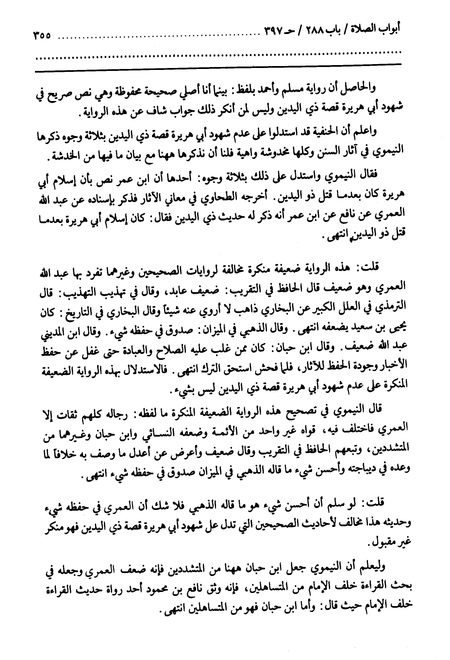 قُلْتُ لَوْ سُلِّمَ أَنَّ أَحْسَنَ شَيْءٍ هُوَ مَا قَالَهُ الذَّهَبِيُّ فَلَا شَكَّ أَنَّ الْعُمَرِيَّ فِي حِفْظِهِ شَيْءٌ وَحَدِيثُهُ هَذَا مُخَالِفٌ لِأَحَادِيثِ الصَّحِيحَيْنِ الَّتِي تَدُلُّ عَلَى شُهُودِ أَبِي هُرَيْرَةَ قِصَّةَ ذِي الْيَدَيْنِ فَهُوَ مُنْكَرٌ غَيْرُ مَقْبُولٍ
