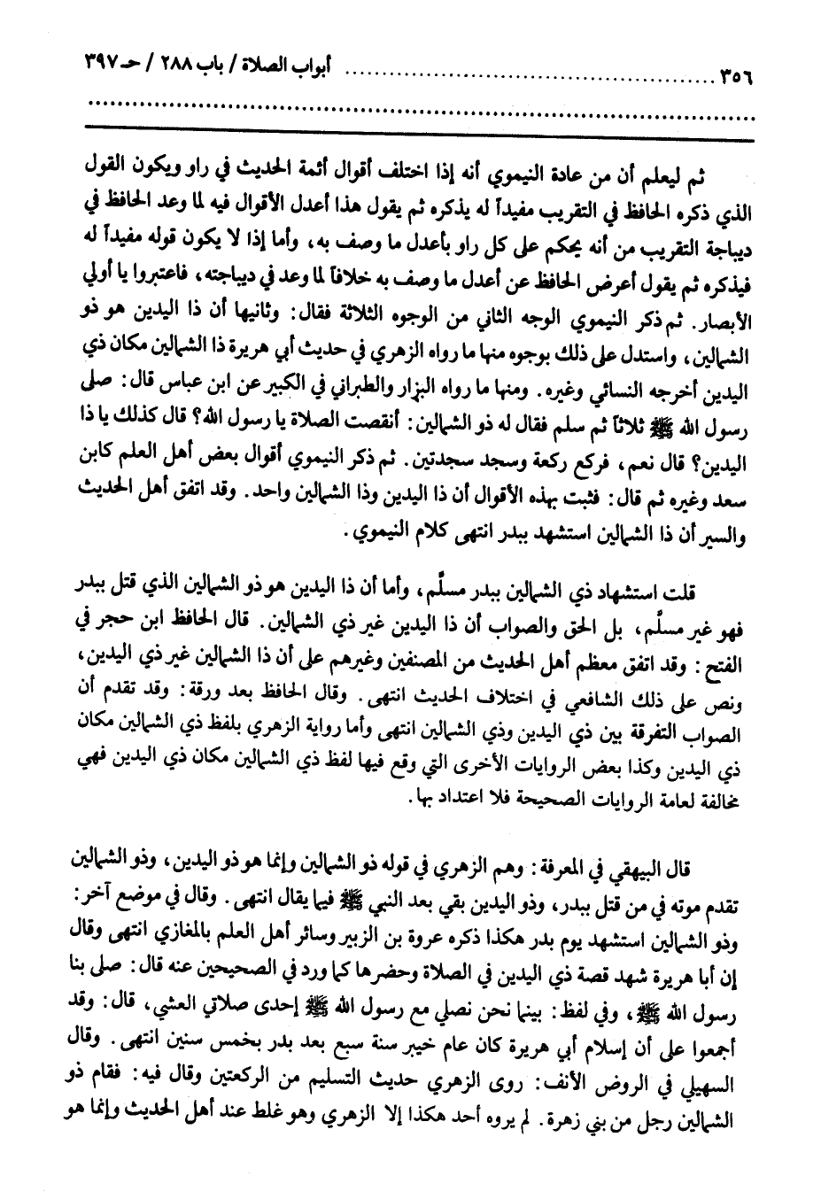 ثُمَّ ذَكَرَ النِّيمَوِيُّ أَقْوَالَ بَعْضِ أَهْلِ الْعِلْمِ كَابْنِ سَعْدٍ وَغَيْرِهِ ثُمَّ قَالَ فَثَبَتَ بِهَذِهِ الْأَقْوَالِ أَنَّ ذَا الْيَدَيْنِ وَذَا الشِّمَالَيْنِ وَاحِدٌ وَقَدِ اتَّفَقَ أَهْلُ الْحَدِيثِ وَالسِّيَرِ أَنَّ ذَا الشِّمَالَيْنِ اسْتُشْهِدَ بِبَدْرٍ انْتَهَى كَلَامُ النِّيمَوِيِّ
