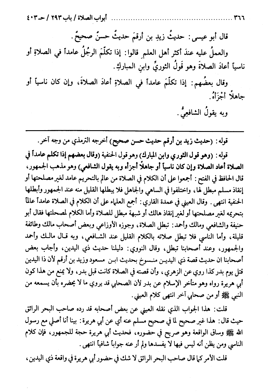 وَقَالَ الْعَيْنِيُّ فِي عُمْدَةِ القارىء أَجْمَعَ الْعُلَمَاءُ عَلَى أَنَّ الْكَلَامَ فِي الصَّلَاةِ عَامِدًا عَالِمًا بِتَحْرِيمِهِ لِغَيْرِ مَصْلَحَتِهَا أَوْ لِغَيْرِ إِنْقَاذِ هَالِكٍ أَوْ شُبْهَةٍ مُبْطِلٌ لِلصَّلَاةِ وَأَمَّا الْكَلَامُ لِمَصْلَحَتِهَا فَقَالَ أَبُو حَنِيفَةَ وَالشَّافِعِيُّ وَمَالِكٌ وَأَحْمَدُ تَبْطُلُ الصَّلَاةُ وَجَوَّزَهُ الْأَوْزَاعِيُّ وَبَعْضُ أَصْحَابِ مَالِكٍ وَطَائِفَةٌ قَلِيلَةٌ وَأَمَّا النَّاسِي فَلَا تَبْطُلُ صلاته بالكلام عِنْدَ الشَّافِعِيِّ وَبِهِ قَالَ مَالِكٌ وَأَحْمَدُ وَالْجُمْهُورُ وَعِنْدَ أَصْحَابِنَا تَبْطُلُ وَقَالَ النَّوَوِيُّ دَلِيلُنَا حَدِيثُ ذِي الْيَدَيْنِ وَأَجَابَ بَعْضُ أَصْحَابِنَا إِنَّ حَدِيثَ قصة ذي اليدين منسوخ بحديث بن مَسْعُودٍ وَزَيْدِ بْنِ أَرْقَمَ لِأَنَّ ذَا الْيَدَيْنِ قُتِلَ يَوْمَ بَدْرٍ كَذَا رُوِيَ عَنِ الزُّهْرِيِّ وَأَنَّ قِصَّتَهُ فِي الصَّلَاةِ كَانَتْ قَبْلَ بَدْرٍ وَلَا يَمْنَعُ مِنْ هَذَا كَوْنُ أَبِي هُرَيْرَةَ رَوَاهُ وَهُوَ مُتَأَخِّرُ الْإِسْلَامِ عَنْ بَدْرٍ لِأَنَّ الصَّحَابِيَّ قَدْ يَرْوِي مَا لَا يَحْضُرُهُ بِأَنْ يَسْمَعَهُ مِنَ النَّبِيِّ صَلَّى اللَّهُ عَلَيْهِ وَسَلَّمَ أَوْ مِنْ صَحَابِيٍّ آخَرَ انْتَهَى كَلَامُ الْعَيْنِيِّ