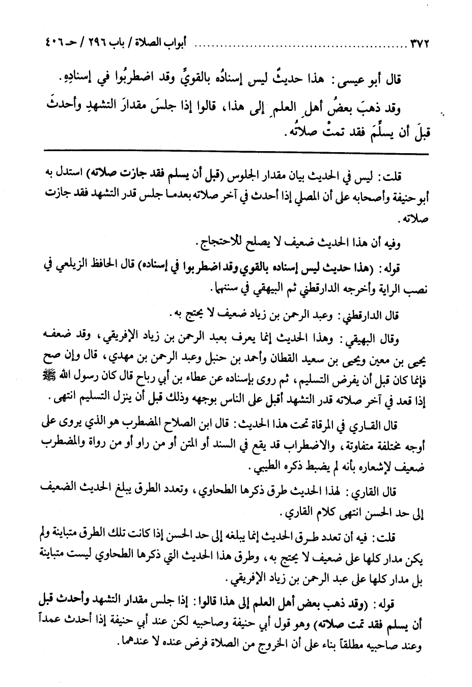 وَقَالَ الْبَيْهَقِيُّ وَهَذَا الْحَدِيثُ إِنَّمَا يُعْرَفُ بِعَبْدِ الرَّحْمَنِ بْنِ زِيَادٍ الْإِفْرِيقِيِّ وَقَدْ ضَعَّفَهُ يَحْيَى بْنُ مَعِينٍ وَيَحْيَى بْنُ سَعِيدٍ الْقَطَّانُ وَأَحْمَدُ بْنُ حَنْبَلٍ وَعَبْدُ الرَّحْمَنِ بْنُ مَهْدِيٍّ قَالَ وَإِنْ صَحَّ فَإِنَّمَا كَانَ قَبْلَ أَنْ يُفْرَضَ التَّسْلِيمُ ثُمَّ رُوِيَ بِإِسْنَادِهِ عَنْ عَطَاءِ بْنِ أَبِي رَبَاحٍ قَالَ كَانَ رَسُولُ اللَّهِ صَلَّى اللَّهُ عَلَيْهِ وَسَلَّمَ إِذَا قَعَدَ فِي آخِرِ صَلَاتِهِ قَدْرَ التَّشَهُّدِ أَقْبَلَ عَلَى النَّاسِ بِوَجْهِهِ وَذَلِكَ قَبْلَ أَنْ ينزل التسليم أنتهى