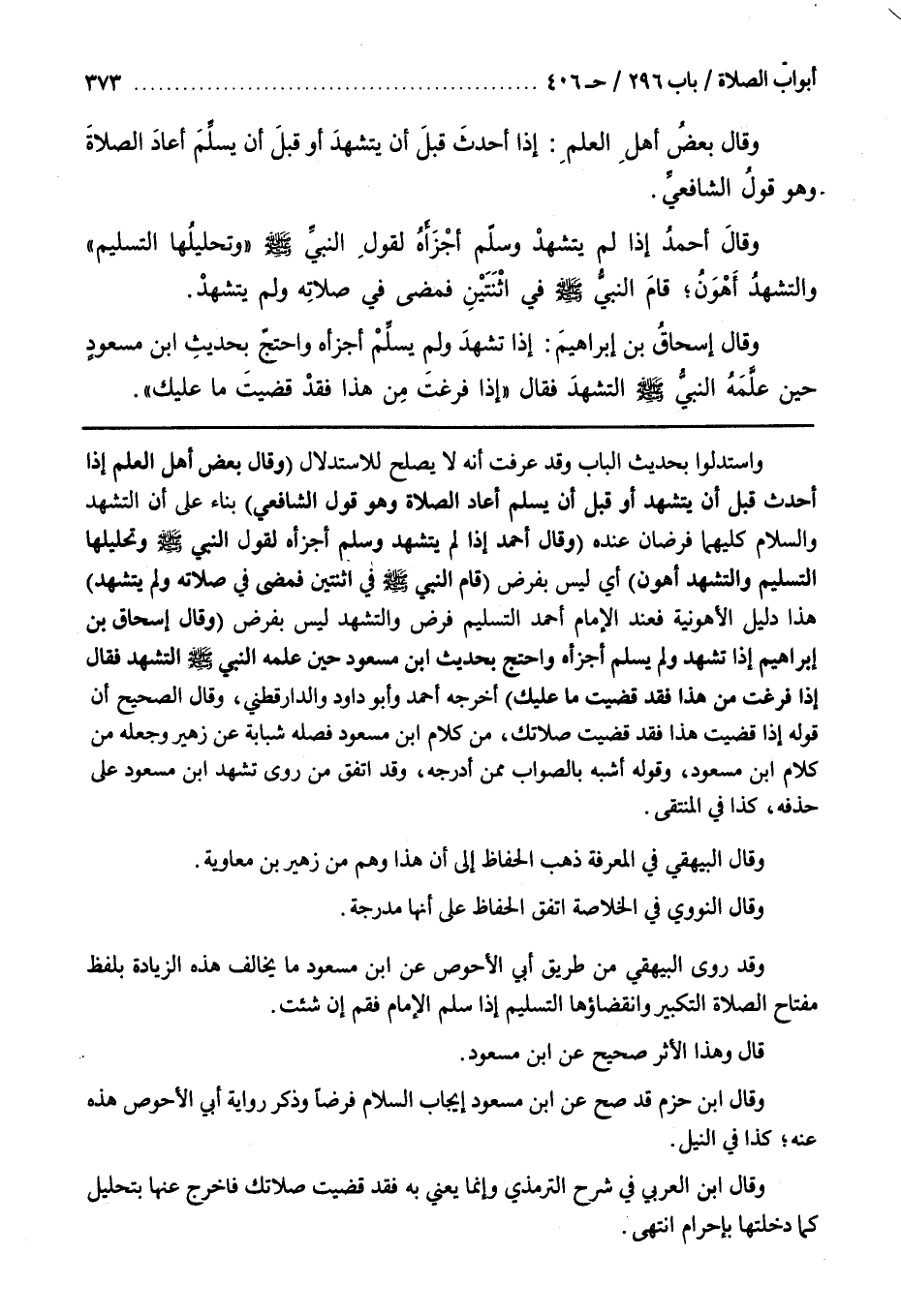 وَاسْتَدَلُّوا بِحَدِيثِ الْبَابِ وَقَدْ عَرَفْتَ أَنَّهُ لَا يَصْلُحُ لِلِاسْتِدْلَالِ (وَقَالَ بَعْضُ أَهْلِ الْعِلْمِ إِذَا أَحْدَثَ قَبْلَ أَنْ يَتَشَهَّدَ أَوْ قَبْلَ أَنْ يُسَلِّمَ أَعَادَ الصَّلَاةَ وَهُوَ قَوْلُ الشَّافِعِيِّ) بِنَاءً عَلَى أَنَّ التَّشَهُّدَ وَالسَّلَامَ كِلَيْهِمَا فَرْضَانِ عِنْدَهُ (وَقَالَ أَحْمَدُ إِذَا لَمْ يَتَشَهَّدْ وَسَلَّمَ أَجْزَأَهُ لِقَوْلِ النَّبِيِّ صَلَّى اللَّهُ عَلَيْهِ وَسَلَّمَ وَتَحْلِيلُهَا التَّسْلِيمُ وَالتَّشَهُّدُ أَهْوَنُ) أَيْ لَيْسَ بِفَرْضٍ قَامَ النَّبِيُّ صَلَّى اللَّهُ عَلَيْهِ وَسَلَّمَ فِي اثْنَتَيْنِ فَمَضَى فِي صَلَاتِهِ وَلَمْ يَتَشَهَّدْ هَذَا دَلِيلُ الْأَهْوَنِيَّةِ فَعِنْدَ الْإِمَامِ أَحْمَدَ التَّسْلِيمُ فَرْضٌ وَالتَّشَهُّدُ لَيْسَ بِفَرْضٍ (وَقَالَ إِسْحَاقُ بْنُ إِبْرَاهِيمَ إِذَا تشهد ولم يسلم أجزأه وأحتج بحديث بن مَسْعُودٍ حِينَ عَلَّمَهُ النَّبِيُّ صَلَّى اللَّهُ عَلَيْهِ وَسَلَّمَ التَّشَهُّدَ فَقَالَ إِذَا فَرَغْتَ مِنْ هَذَا فَقَدْ قَضَيْتَ مَا عَلَيْكَ) أَخْرَجَهُ أَحْمَدُ وَأَبُو دَاوُدَ وَالدَّارَقُطْنِيُّ