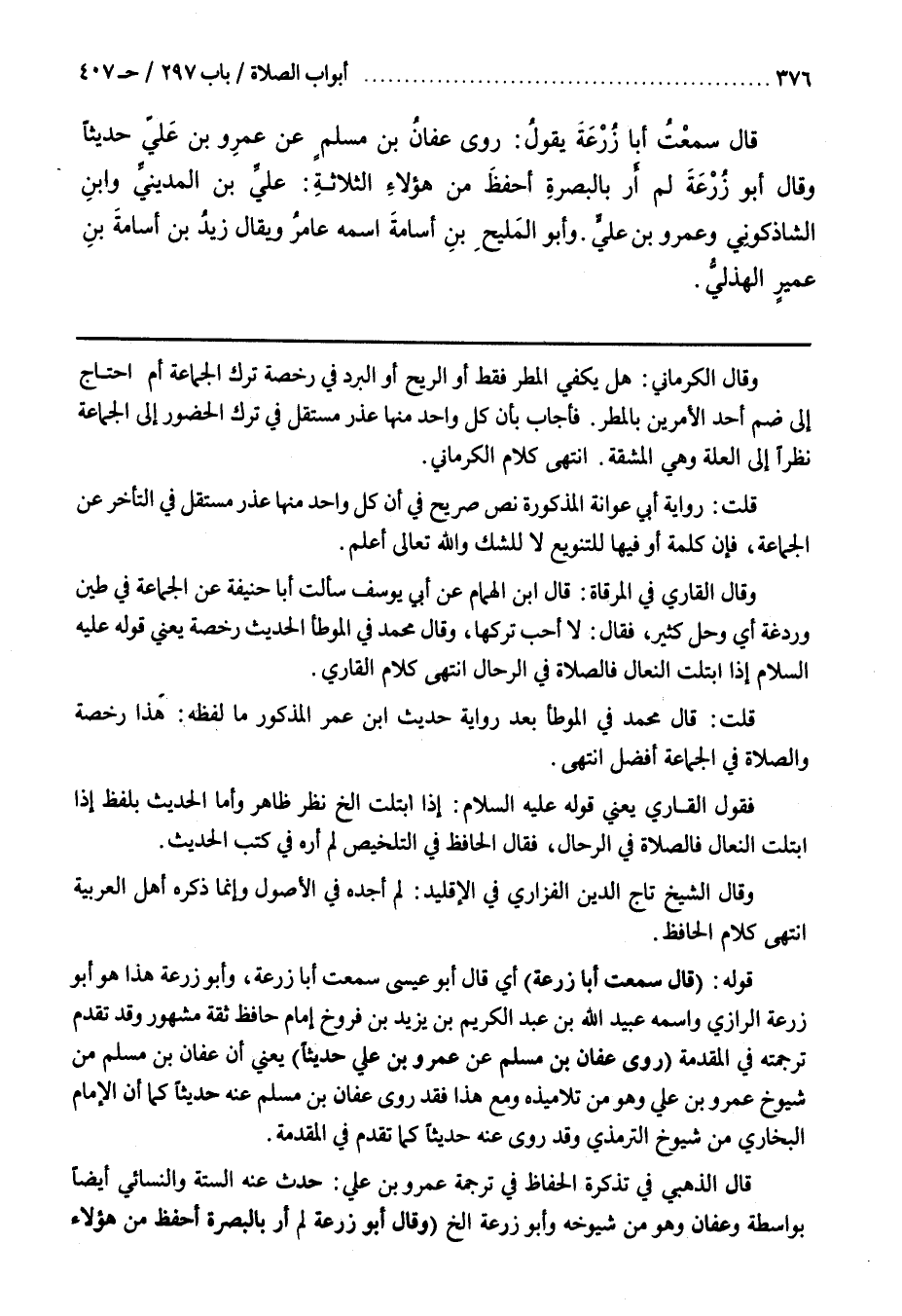 قَوْلُهُ (قَالَ سَمِعْتُ أَبَا زُرْعَةَ) أَيْ قَالَ أَبُو عِيسَى سَمِعْتُ أَبَا زُرْعَةَ وَأَبُو زُرْعَةَ هَذَا هُوَ أَبُو زُرْعَةَ الرَّازِيُّ وَاسْمُهُ عُبَيْدُ اللَّهِ بْنُ عَبْدِ الْكَرِيمِ بْنِ يَزِيدَ بْنِ فَرُّوخَ إِمَامٌ حَافِظٌ ثِقَةٌ مَشْهُورٌ وَقَدْ تَقَدَّمَ تَرْجَمَتُهُ فِي الْمُقَدِّمَةِ (رَوَى عَفَّانُ بْنُ مُسْلِمٍ عَنْ عَمْرِو بْنِ عَلِيٍّ حَدِيثًا) يَعْنِي أَنَّ عَفَّانَ بْنَ مُسْلِمٍ مِنْ شُيُوخِ عَمْرِو بْنِ عَلِيٍّ وَهُوَ مِنْ تَلَامِيذِهِ وَمَعَ هَذَا فَقَدْ رَوَى عَفَّانُ بْنُ مُسْلِمٍ عَنْهُ حَدِيثًا كَمَا أَنَّ الْإِمَامَ الْبُخَارِيَّ مِنْ شُيُوخِ التِّرْمِذِيِّ وَقَدْ رَوَى عَنْهُ حَدِيثًا كَمَا تَقَدَّمَ فِي الْمُقَدِّمَةِ