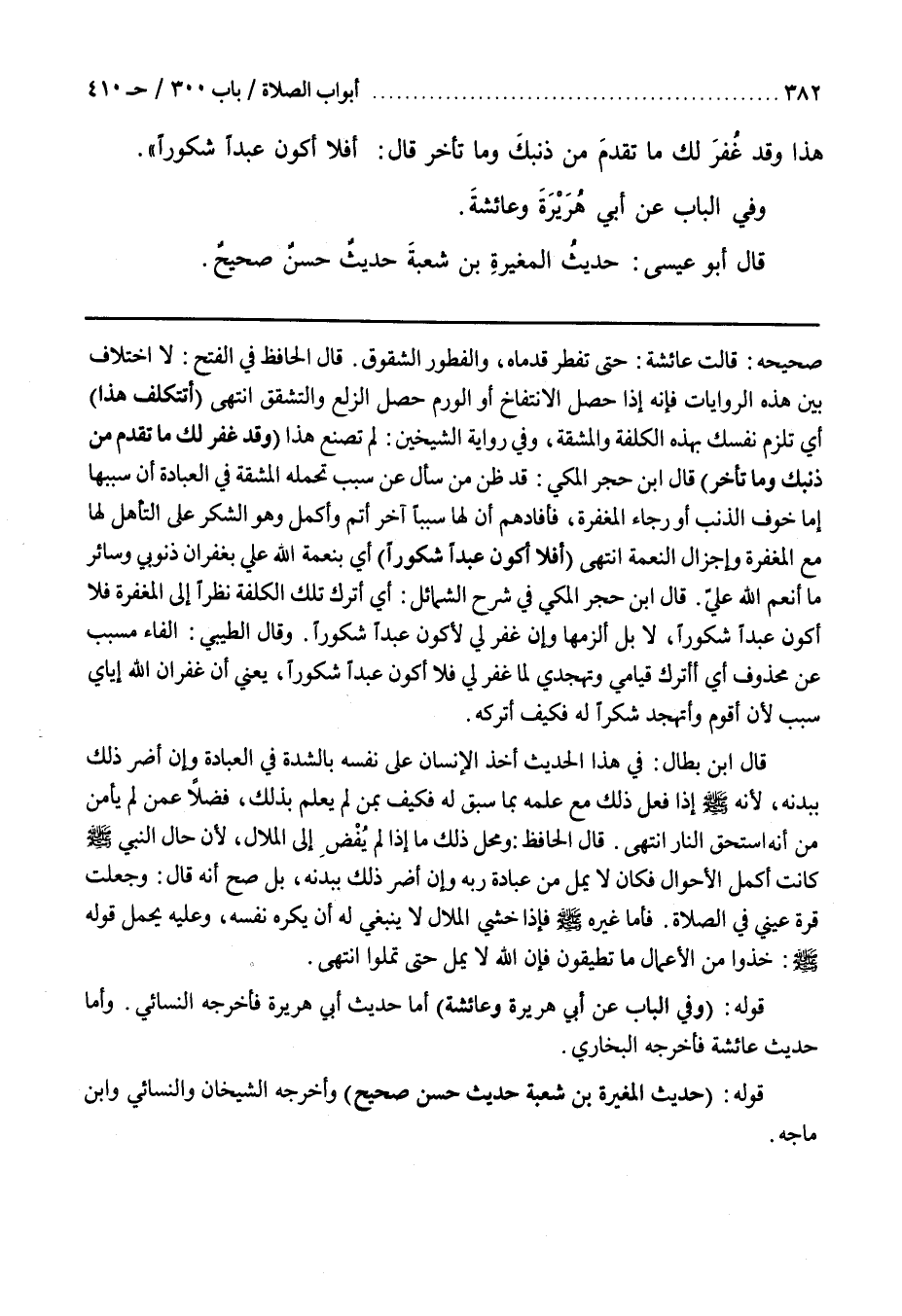 قال بن حَجَرٍ الْمَكِّيُّ فِي شَرْحِ الشَّمَائِلِ أَيِ أَتْرُكُ تِلْكَ الْكُلْفَةَ نَظَرًا إِلَى الْمَغْفِرَةِ فَلَا أَكُونُ عَبْدًا شَكُورًا لَا بَلْ أَلْزَمُهَا وَإِنْ غُفِرَ لِي لِأَكُونَ عَبْدًا شَكُورًا