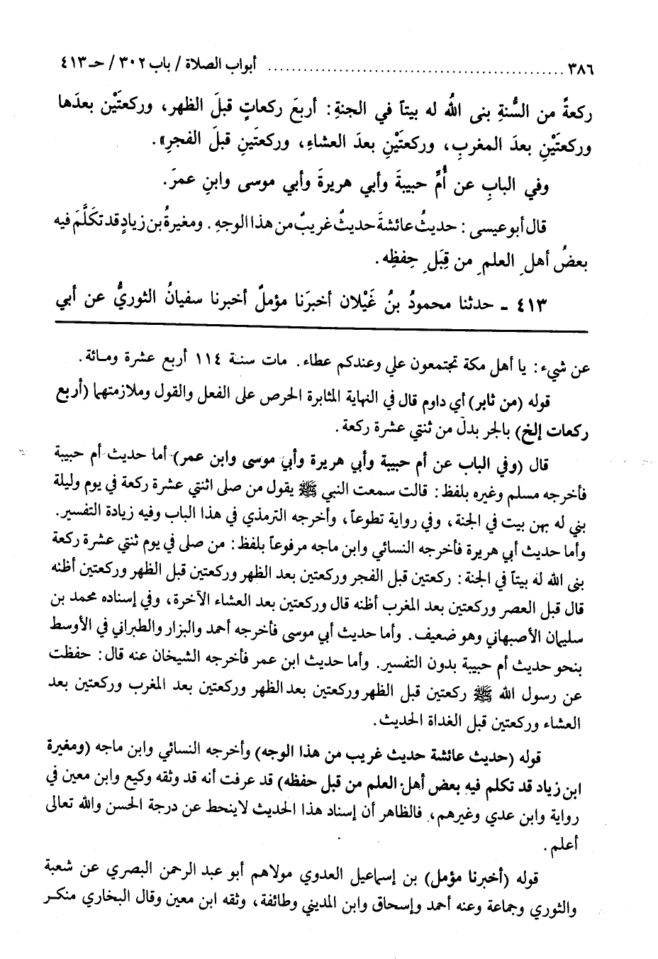 وأما حديث أبي هريرة فأخرجه النسائي وبن مَاجَهْ مَرْفُوعًا بِلَفْظِ مَنْ صَلَّى فِي يَوْمٍ ثِنْتَيْ عَشْرَةَ رَكْعَةً بَنَى اللَّهُ لَهُ بَيْتًا فِي الْجَنَّةِ رَكْعَتَيْنِ قَبْلَ الْفَجْرِ وَرَكْعَتَيْنِ بَعْدَ الظُّهْرِ وَرَكْعَتَيْنِ قَبْلَ الظُّهْرِ وَرَكْعَتَيْنِ أَظُنُّهُ قَالَ قَبْلَ الْعَصْرِ وَرَكْعَتَيْنِ بَعْدَ الْمَغْرِبِ أَظُنُّهُ قَالَ وَرَكْعَتَيْنِ بَعْدَ الْعِشَاءِ الْآخِرَةِ وَفِي إِسْنَادِهِ مُحَمَّدُ بْنُ سُلَيْمَانَ الْأَصْبَهَانِيُّ وَهُوَ ضَعِيفٌ