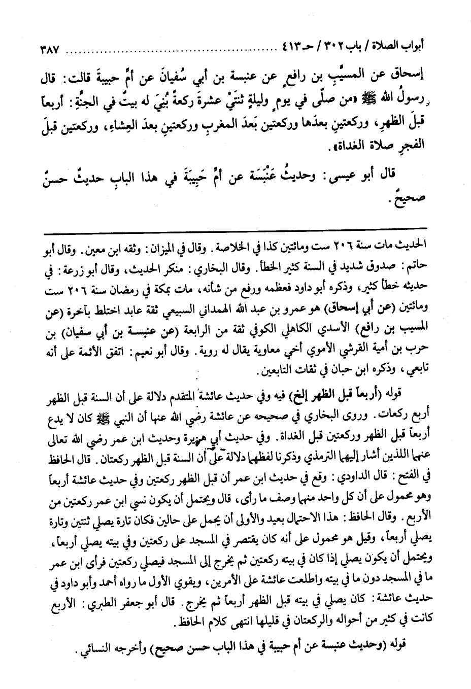 قَوْلُهُ (وَحَدِيثُ عَنْبَسَةَ عَنْ أُمِّ حَبِيبَةَ فِي هَذَا الْبَابِ حَسَنٌ صَحِيحٌ) وَأَخْرَجَهُ النَّسَائِيُّ