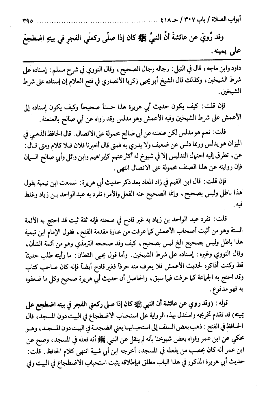 قَوْلُهُ (وَقَدْ رُوِيَ عَنْ عَائِشَةَ أَنَّ النَّبِيَّ صَلَّى اللَّهُ عَلَيْهِ وَسَلَّمَ كَانَ إِذَا صَلَّى رَكْعَتَيِ الْفَجْرِ فِي بَيْتِهِ اضْطَجَعَ عَلَى يَمِينِهِ) قَدْ تَقَدَّمَ تَخْرِيجُهُ وَاسْتُدِلَّ بِهَذِهِ الرِّوَايَةِ عَلَى اسْتِحْبَابِ الِاضْطِجَاعِ فِي الْبَيْتِ دُونَ الْمَسْجِدِ وهو محكي عن بن عُمَرَ وَقَوَّاهُ بَعْضُ شُيُوخِنَا بِأَنَّهُ لَمْ يُنْقَلْ عَنِ النَّبِيِّ صَلَّى اللَّهُ عَلَيْهِ وَسَلَّمَ أَنَّهُ فعله في المسجد وصح عن بن عُمَرَ أَنَّهُ كَانَ يَحْصِبُ مَنْ يَفْعَلُهُ فِي المسجد فِي هَذَا الْبَابِ مُطْلَقٌ فَبِإِطْلَاقِهِ يَثْبُتُ اسْتِحْبَابُ الاضطجاع في البيت وفي