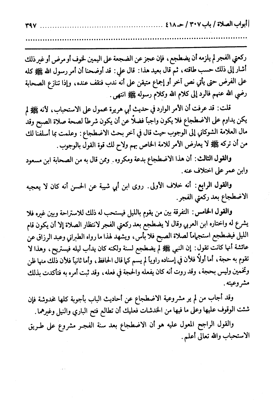 قُلْتُ قَدْ عَرَفْتَ أَنَّ الْأَمْرَ الْوَارِدَ فِي حَدِيثِ أَبِي هُرَيْرَةَ مَحْمُولٌ عَلَى الِاسْتِحْبَابِ لِأَنَّهُ صَلَّى اللَّهُ عَلَيْهِ وَسَلَّمَ لَمْ يَكُنْ يُدَاوِمُ عَلَى الِاضْطِجَاعِ فَلَا يَكُونُ وَاجِبًا فَضْلًا عَنْ أَنْ يَكُونَ شَرْطًا لِصِحَّةِ صَلَاةِ الصُّبْحِ وَقَدْ مَالَ الْعَلَّامَةُ الشَّوْكَانِيُّ إِلَى الْوُجُوبِ حَيْثُ قَالَ فِي آخِرِ بَحْثِ الِاضْطِجَاعِ وَعَلِمْتَ بِمَا أَسْلَفْنَا لَكَ مِنْ أَنَّ تَرْكَهُ صَلَّى اللَّهُ عَلَيْهِ وَسَلَّمَ لَا يُعَارِضُ الْأَمْرَ لِلْأُمَّةِ الْخَاصَّ بِهِمْ وَلَاحَ لَكَ قُوَّةُ الْقَوْلِ بِالْوُجُوبِ