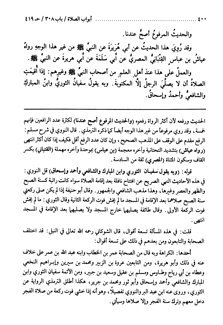 قَوْلُهُ وَبِهِ يقول سفيان الثوري وبن الْمُبَارَكِ وَالشَّافِعِيُّ وَأَحْمَدُ وَإِسْحَاقُ قَالَ النَّوَوِيُّ فِي هَذِهِ الْأَحَادِيثِ النَّهْيُ الصَّرِيحُ عَنِ افْتِتَاحِ نَافِلَةٍ بَعْدَ إِقَامَةِ الصَّلَاةِ سَوَاءٌ كَانَتْ رَاتِبَةً كَسُنَّةِ الصُّبْحِ وَالظُّهْرِ وَالْعَصْرِ وَغَيْرِهَا وَهَذَا مَذْهَبُ الشَّافِعِيِّ وَالْجُمْهُورِ