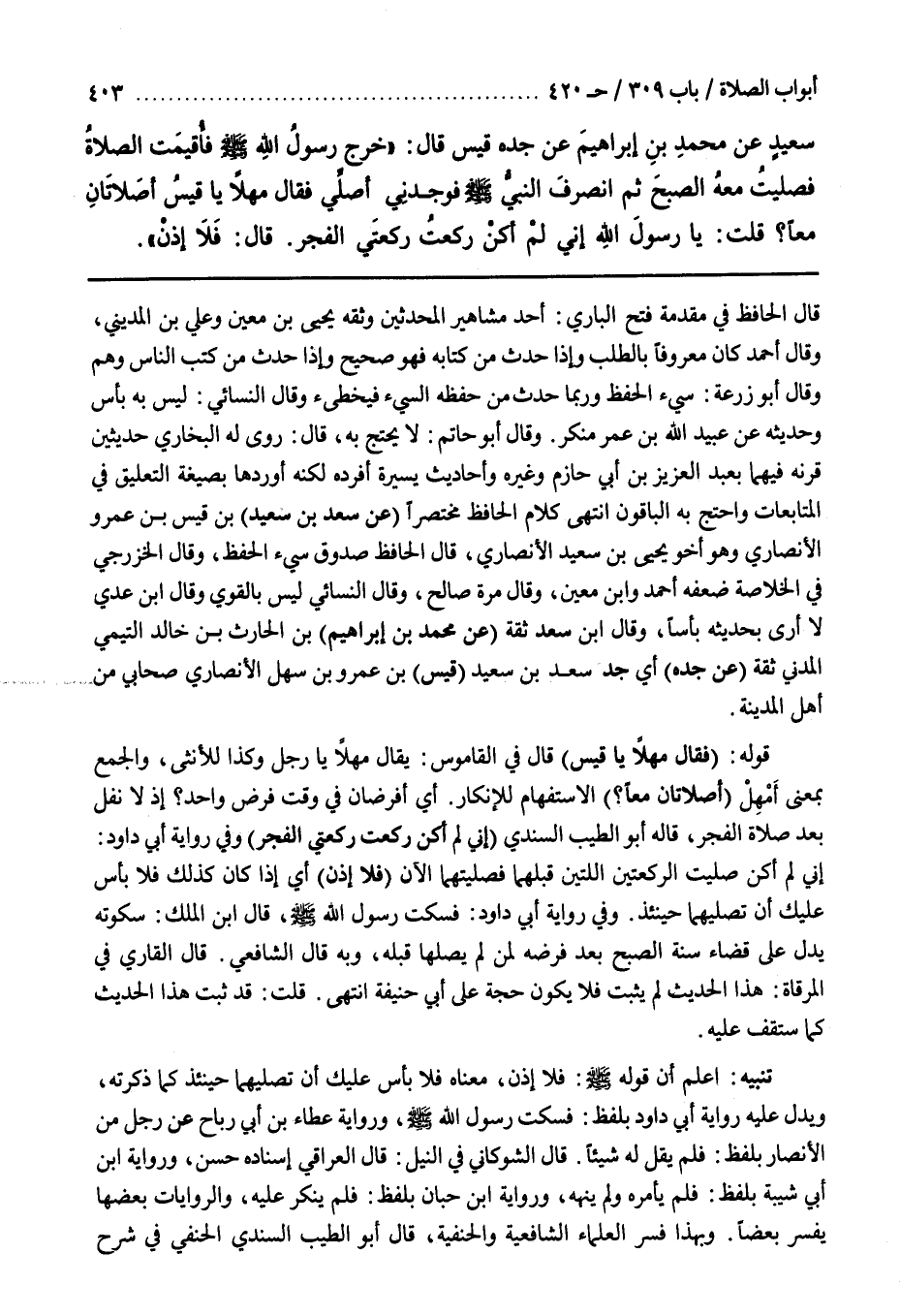 وَقَالَ أَبُو حَاتِمٍ لَا يُحْتَجُّ بِهِ قَالَ رَوَى لَهُ الْبُخَارِيُّ حَدِيثَيْنِ قَرَنَهُ فِيهِمَا بِعَبْدِ الْعَزِيزِ بْنِ أَبِي حَازِمٍ وَغَيْرِهِ وَأَحَادِيثَ يَسِيرَةً أَفْرَدَهُ لَكِنَّهُ أَوْرَدَهَا بِصِيغَةِ التَّعْلِيقِ فِي الْمُتَابَعَاتِ وَاحْتَجَّ بِهِ الْبَاقُونَ انْتَهَى كَلَامُ الْحَافِظِ مُخْتَصَرًا (عَنْ سَعْدِ بْنِ سَعِيدِ) بْنِ قَيْسِ بْنِ عَمْرٍو الْأَنْصَارِيِّ وَهُوَ أَخُو يَحْيَى بْنِ سَعِيدٍ الْأَنْصَارِيِّ قَالَ الحافظ صدوق سيء الْحِفْظِ وَقَالَ الْخَزْرَجِيُّ فِي الْخُلَاصَةِ ضَعَّفَهُ أَحْمَدُ وبن مَعِينٍ وَقَالَ مَرَّةً صَالِحٌ وَقَالَ النَّسَائِيُّ لَيْسَ بالقوي وقال بن عدي لا أرى بحديثه بأسا وقال بن سَعْدٍ ثِقَةٌ (عَنْ مُحَمَّدِ بْنِ إِبْرَاهِيمَ) بْنِ الْحَارِثِ بْنِ خَالِدٍ التَّيْمِيِّ الْمَدَنِيِّ ثِقَةٌ (عَنْ جَدِّهِ) أَيْ جَدِّ سَعْدِ بْنِ سَعِيدٍ (قَيْسِ) بْنِ عَمْرِو بْنِ سَهْلٍ الْأَنْصَارِيِّ صَحَابِيٌّ مِنْ أَهْلِ الْمَدِينَةِ