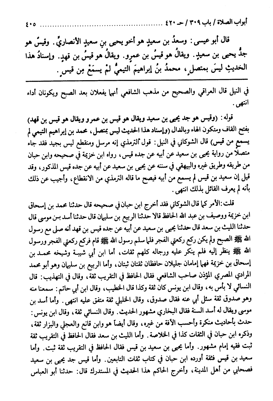 قَوْلُهُ (وَقَيْسٌ هُوَ جَدُّ يَحْيَى بْنِ سَعِيدٍ وَيُقَالُ هُوَ قَيْسُ بْنُ عَمْرٍو وَيُقَالُ هُوَ قَيْسُ بْنُ قَهْدٍ) بِفَتْحِ الْقَافِ وَسُكُونِ الْهَاءِ وَبِالدَّالِ (وَإِسْنَادُ هَذَا الْحَدِيثِ لَيْسَ بِمُتَّصِلٍ مُحَمَّدُ بْنُ إِبْرَاهِيمَ التَّيْمِيُّ لَمْ يَسْمَعْ مِنْ قَيْسٍ) قَالَ الشَّوْكَانِيُّ فِي النَّيْلِ قَوْلُ التِّرْمِذِيِّ إِنَّهُ مُرْسَلٌ وَمُنْقَطِعٌ لَيْسَ بِجَيِّدٍ فَقَدْ جَاءَ مُتَّصِلًا مِنْ رِوَايَةِ يَحْيَى بْنِ سَعِيدٍ عَنْ أبيه عن جده قيس رواه بن خزيمة في صحيحه وبن حِبَّانَ مِنْ طَرِيقِهِ وَطَرِيقِ غَيْرِهِ وَالْبَيْهَقِيُّ فِي سُنَنِهِ عَنْ يَحْيَى بْنِ سَعِيدٍ عَنْ أَبِيهِ عَنْ جَدِّهِ قَيْسٍ الْمَذْكُورِ وَقَدْ قِيلَ إِنَّ سَعِيدَ بْنَ قَيْسٍ لَمْ يَسْمَعْ مِنْ أَبِيهِ فَيَصِحُّ مَا قَالَهُ التِّرْمِذِيُّ مِنَ الِانْقِطَاعِ وَأُجِيبَ عَنْ ذَلِكَ بِأَنَّهُ لَمْ يَعْرِفِ الْقَائِلَ بِذَلِكَ انْتَهَى