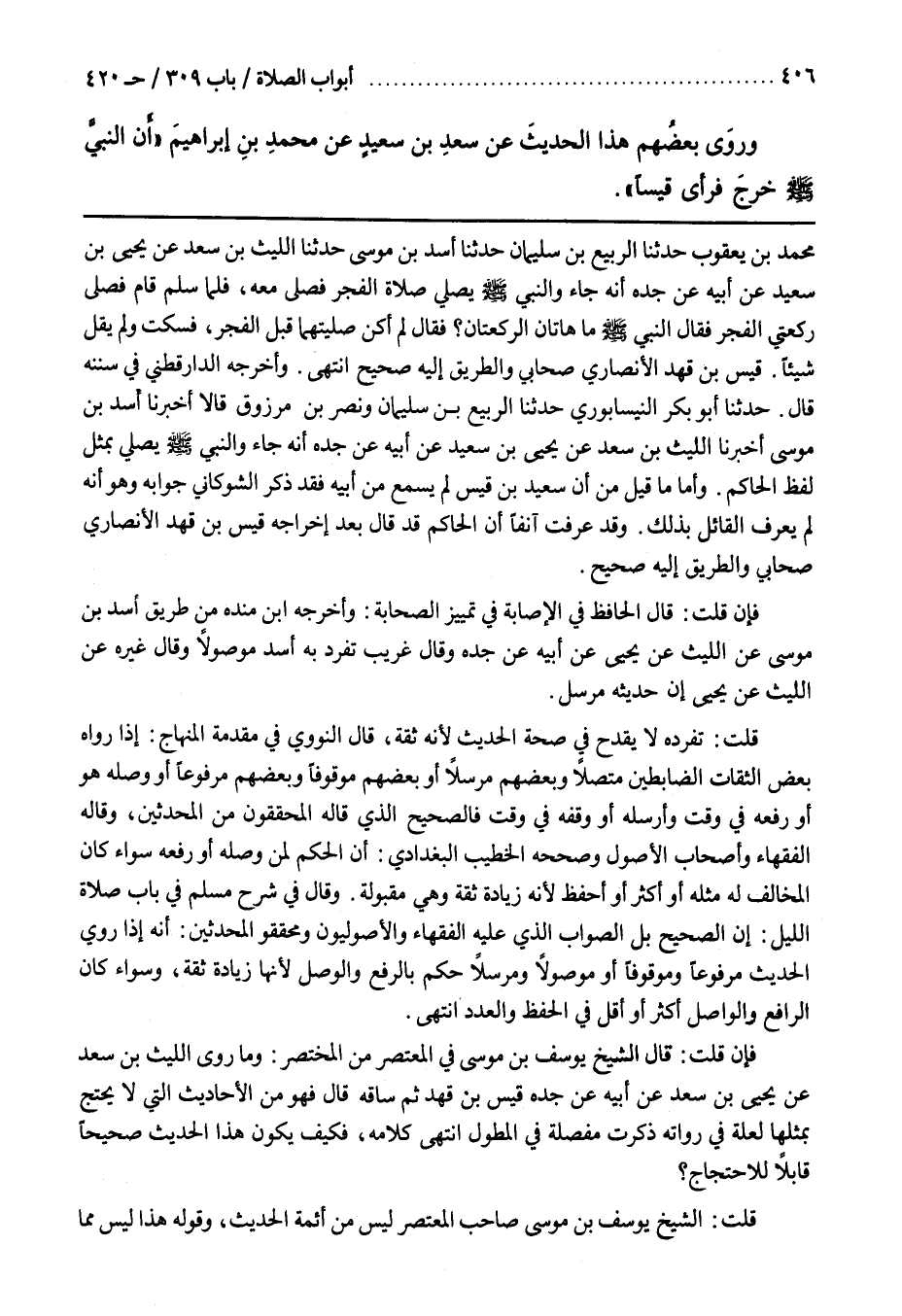 فَإِنْ قُلْتَ قَالَ الشَّيْخُ يُوسُفُ بْنُ مُوسَى فِي المعتصر من المحتصر وَمَا رَوَى اللَّيْثُ بْنُ سَعْدٍ عَنْ يَحْيَى بن سعيد عن أبيه عن جده قيس بن قهد ثم ساقه ثم قَالَ فَهُوَ مِنَ الْأَحَادِيثِ الَّتِي لَا يُحْتَجُّ بِمِثْلِهَا لِعِلَّةٍ فِي رُوَاتِهِ ذُكِرَتْ مُفَصَّلَةً فِي الْمُطَوَّلِ انْتَهَى كَلَامُهُ فَكَيْفَ يَكُونُ هَذَا الْحَدِيثُ صحيحا قابلا للاحتجاح قُلْتُ الشَّيْخُ يُوسُفُ بْنُ مُوسَى صَاحِبُ الْمُعْتَصَرِ لَيْسَ مِنْ أَئِمَّةِ الْحَدِيثِ وَقَوْلُهُ هَذَا لَيْسَ مما