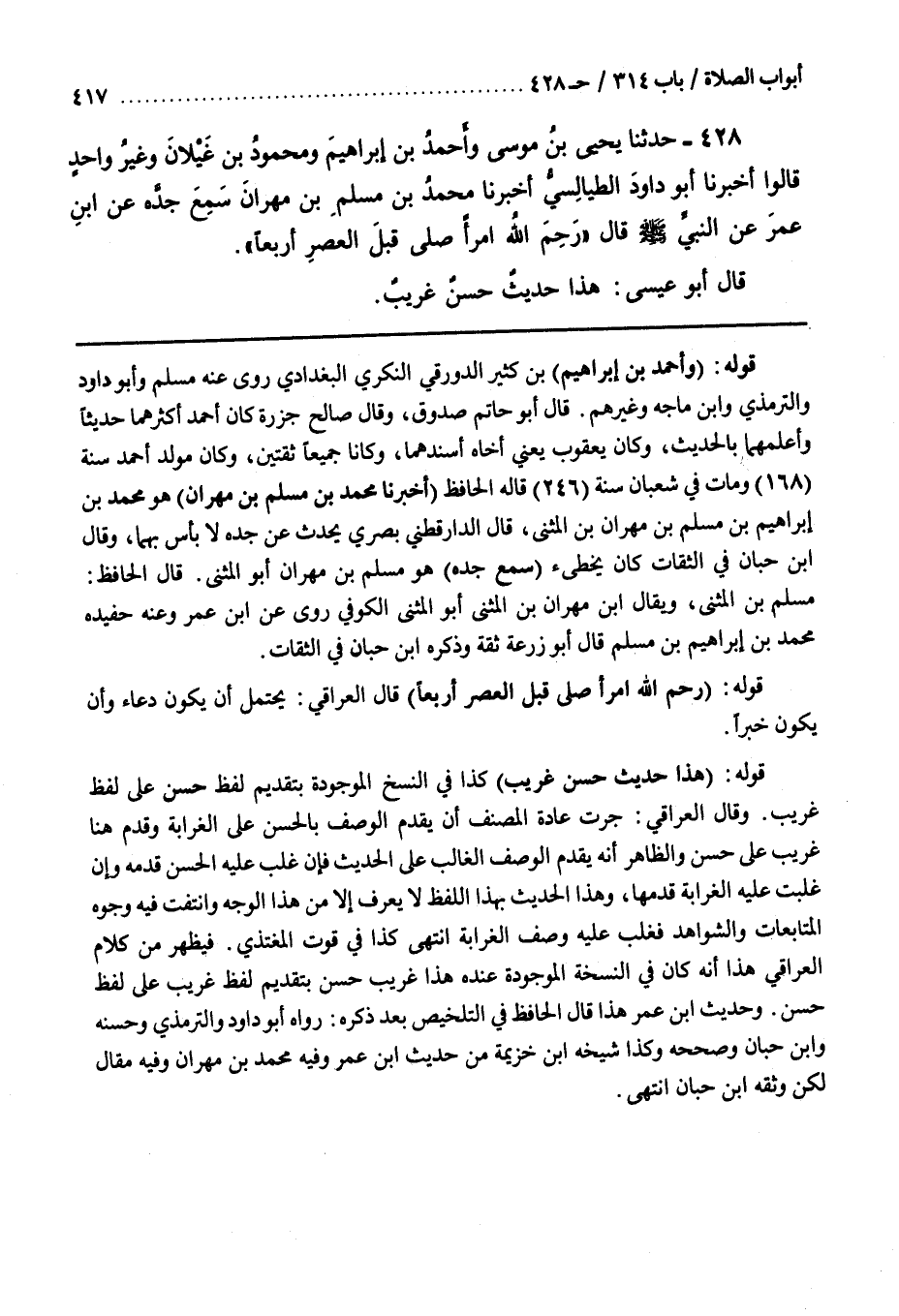 فَيَظْهَرُ مِنْ كَلَامِ الْعِرَاقِيِّ هَذَا أَنَّهُ كَانَ فِي النُّسْخَةِ الْمَوْجُودَةِ عِنْدَهُ هَذَا غَرِيبٌ حَسَنٌ بِتَقْدِيمِ لَفْظِ غَرِيبٍ عَلَى لَفْظِ حسن