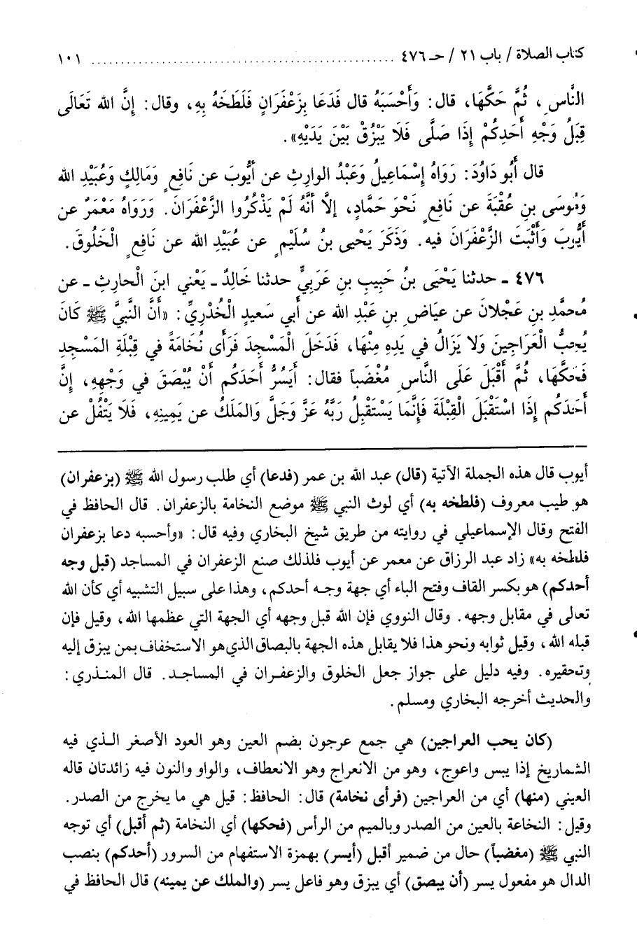 أَيُّوبَ قَالَ هَذِهِ الْجُمْلَةَ الْآتِيَةَ (قَالَ) عَبْدُ اللَّهِ بْنُ عُمَرَ (فَدَعَا) أَيْ طَلَبَ رَسُولُ اللَّهِ صَلَّى اللَّهُ عَلَيْهِ وَسَلَّمَ (بِزَعْفَرَانٍ) هُوَ طِيبٌ مَعْرُوفٌ (فَلَطَّخَهُ بِهِ) أَيْ لَوَّثَ النَّبِيُّ صَلَّى اللَّهُ عَلَيْهِ وَسَلَّمَ مَوْضِعَ النُّخَامَةِ بِالزَّعْفَرَانِ