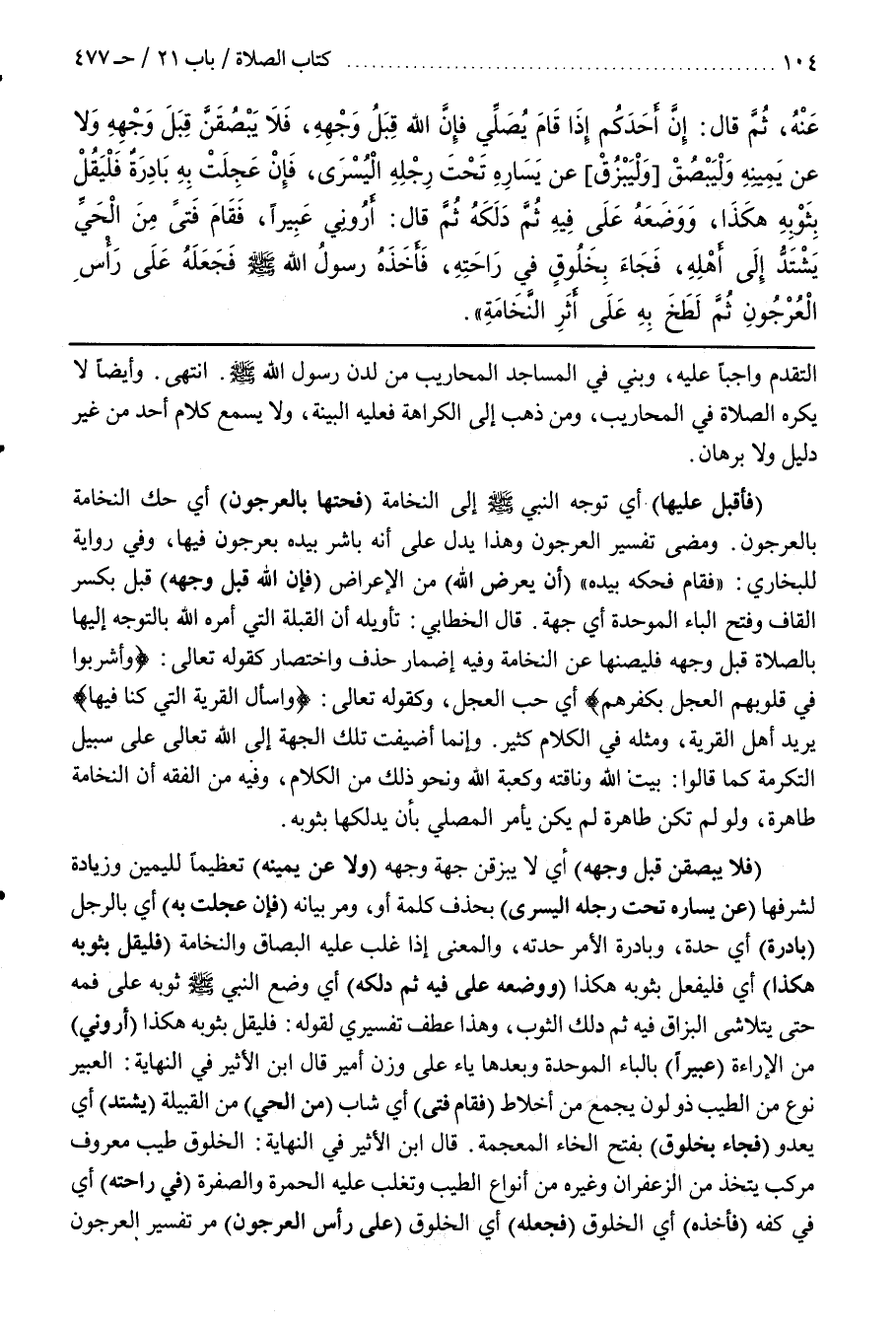 (فَلَا يَبْصُقَنَّ قِبَلَ وَجْهِهِ) أَيْ لَا يَبْزُقَنَّ جِهَةِ وَجْهِهِ (وَلَا عَنْ يَمِينِهِ) تَعْظِيمًا لِلْيَمِينِ وَزِيَادَةً لِشَرَفِهَا (عَنْ يَسَارِهِ تَحْتَ رِجْلِهِ الْيُسْرَى) بِحَذْفِ كَلِمَةِ أَوْ وَمَرَّ بَيَانُهُ (فَإِنْ عَجِلَتْ بِهِ) أَيْ بِالرِّجْلِ (بَادِرَةٌ) أَيْ حِدَّةٌ وَبَادِرَةُ الْأَمْرِ حِدَّتُهُ وَالْمَعْنَى إِذَا غَلَبَ عَلَيْهِ الْبُصَاقُ وَالنُّخَامَةُ (فَلْيَقُلْ بِثَوْبِهِ هَكَذَا) أَيْ فَلْيَفْعَلْ بِثَوْبِهِ هَكَذَا (وَوَضَعَهُ عَلَى فِيهِ ثُمَّ دَلَكَهُ) أَيْ وَضَعَ النَّبِيُّ صَلَّى اللَّهُ عَلَيْهِ وَسَلَّمَ ثَوْبَهُ عَلَى فَمِهِ حَتَّى يَتَلَاشَى الْبُزَاقُ فِيهِ ثُمَّ دَلَكَ الثَّوْبَ وَهَذَا عَطْفٌ تَفْسِيرِيٌّ لِقَوْلِهِ فَلْيَقُلْ بِثَوْبِهِ هَكَذَا (أَرُونِي) مِنَ الْإِرَاءَةِ (عَبِيرًا) بِالْبَاءِ الْمُوَحَّدَةِ وَبَعْدَهَا يَاءٌ عَلَى وزن أمير قال بن الْأَثِيرِ فِي النِّهَايَةِ الْعَبِيرُ نَوْعٌ مِنَ الطِّيبِ ذُو لَوْنٍ يُجْمَعُ مِنْ أَخْلَاطٍ (فَقَامَ فَتًى) أَيْ شَابٌّ (مِنَ الْحَيِّ) مِنَ الْقَبِيلَةِ (يَشْتَدُّ) أَيْ يَعْدُو (فَجَاءَ بِخَلُوقٍ) بِفَتْحِ الْخَاءِ الْمُعْجَمَةِ