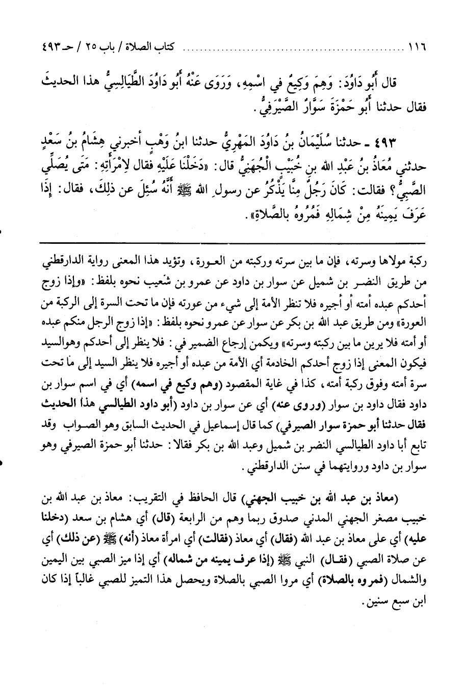 [497] (مُعَاذُ بْنُ عَبْدِ اللَّهِ بْنِ خُبَيْبٍ الْجُهَنِيُّ) قَالَ الْحَافِظُ فِي التَّقْرِيبِ مُعَاذُ بْنُ عَبْدِ اللَّهِ بْنِ خُبَيْبٍ مُصَغَّرٌ الْجُهَنِيُّ الْمَدَنِيُّ صَدُوقٌ رُبَّمَا وَهِمَ مِنَ الرَّابِعَةِ (قَالَ) أَيْ هِشَامُ بْنُ سَعْدٍ (دَخَلْنَا عَلَيْهِ) أَيْ عَلَى مُعَاذِ بْنِ عَبْدِ اللَّهِ (فَقَالَ) أَيْ مُعَاذُ (فَقَالَتْ) أَيْ امْرَأَةُ مُعَاذٍ (أَنَهُ) صَلَّى اللَّهُ عَلَيْهِ وَسَلَّمَ (عَنْ ذَلِكَ) أَيْ عَنْ صَلَاةِ الصَّبِيِّ (فَقَالَ) النَّبِيُّ صَلَّى اللَّهُ عَلَيْهِ وَسَلَّمَ (إِذَا عَرَفَ يَمِينَهُ مِنْ شِمَالِهِ) أَيْ إِذَا مَيَّزَ الصَّبِيُّ بَيْنَ الْيَمِينِ وَالشِّمَالِ (فَمُرُوهُ بِالصَّلَاةِ) أَيْ مَرُوا الصَّبِيَّ بِالصَّلَاةِ وَيَحْصُلُ هَذَا التمييز للصبي غالبا إذا كان بن سبع سنين